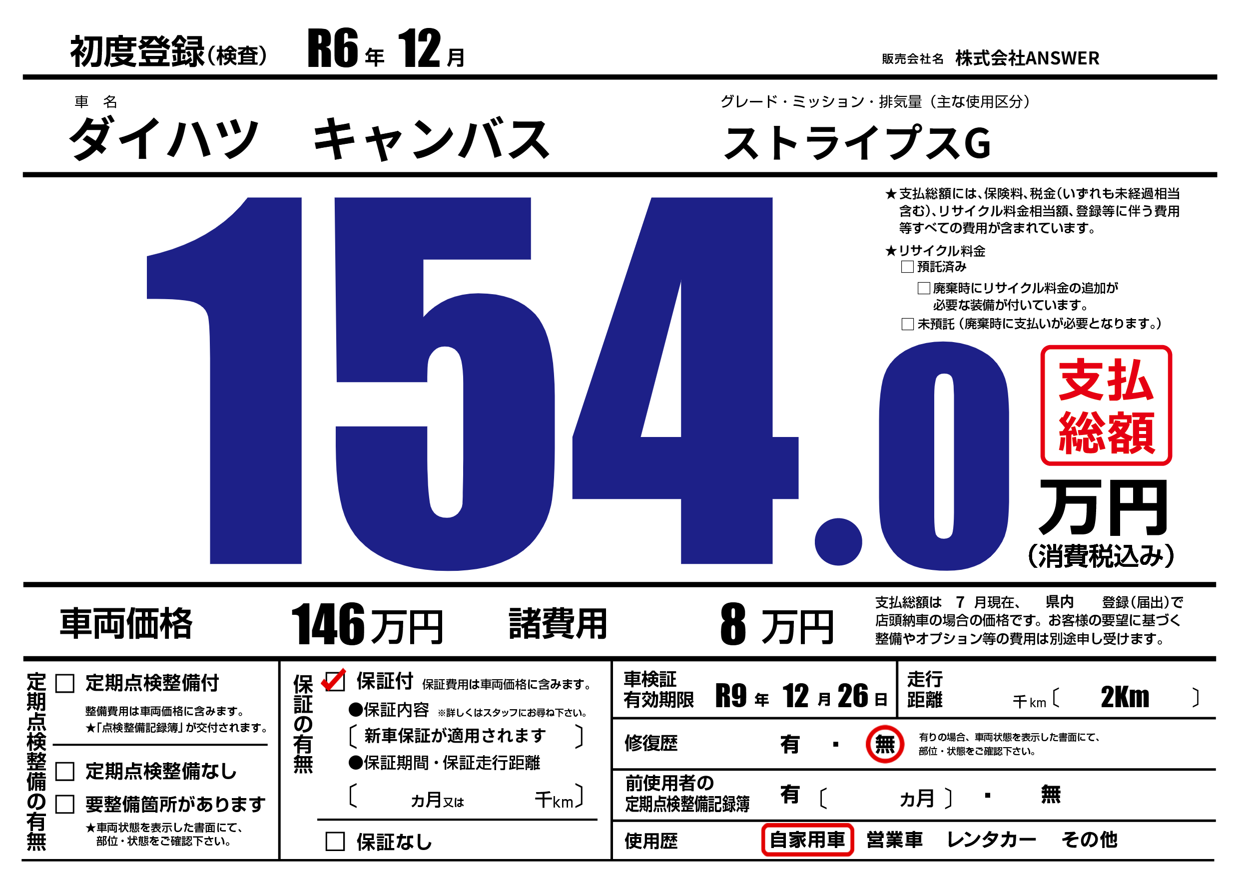 保証付き 保証内容(新車保証が適用されます) ---ヶ月または()千kmまで |