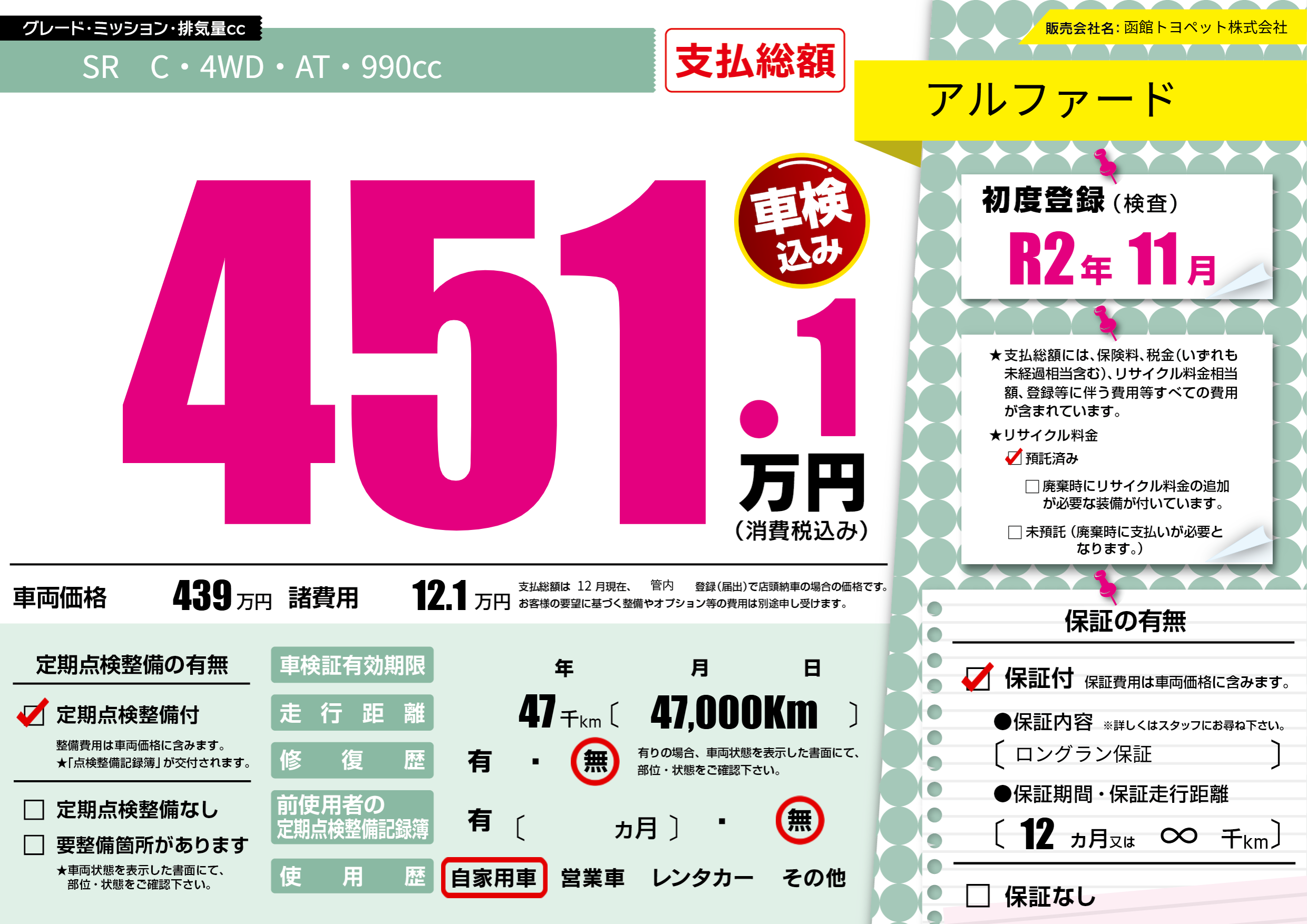 | 走行キロ | 4.7万km | 初年度登録 | R2年11月 |