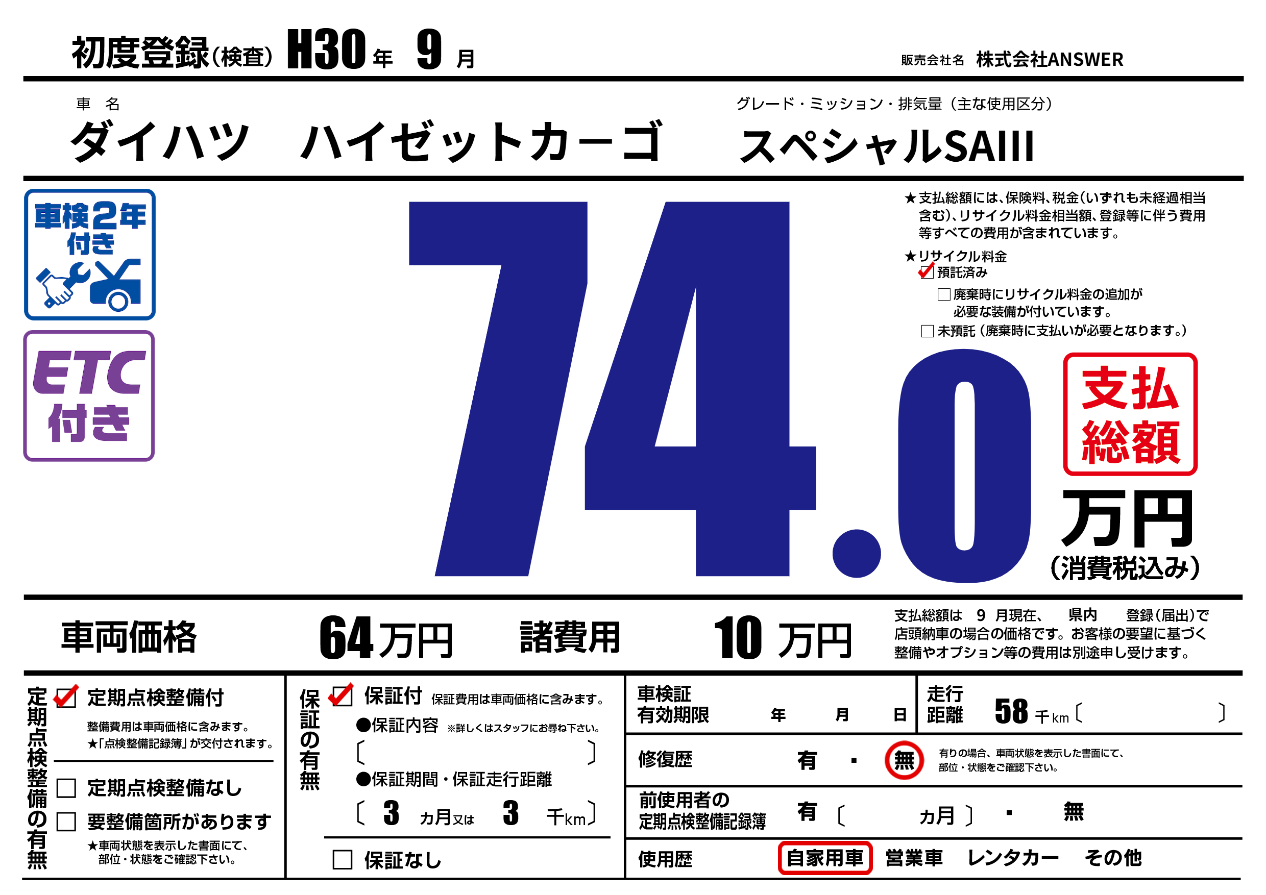 保証付き 保証内容(---) 3ヶ月または(3)千kmまで |