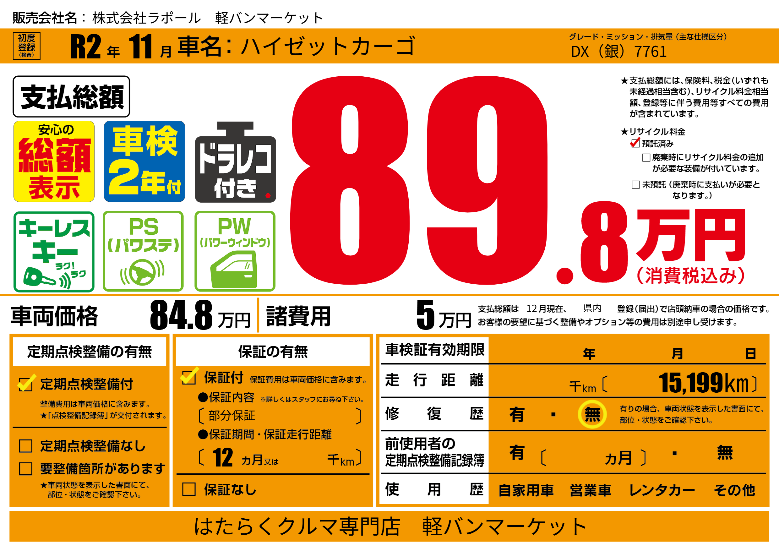 | 車名 | ハイゼットカーゴ | グレード ミッション 排気量 |