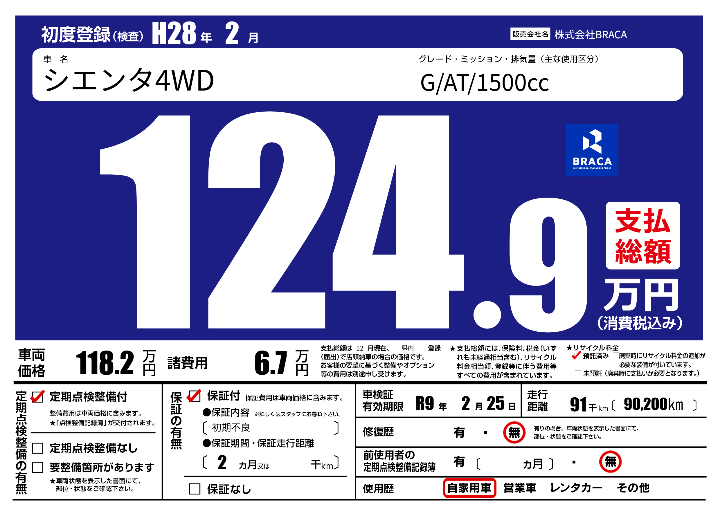 | 車名 | シエンタ4WD | グレード ミッション 排気量 |