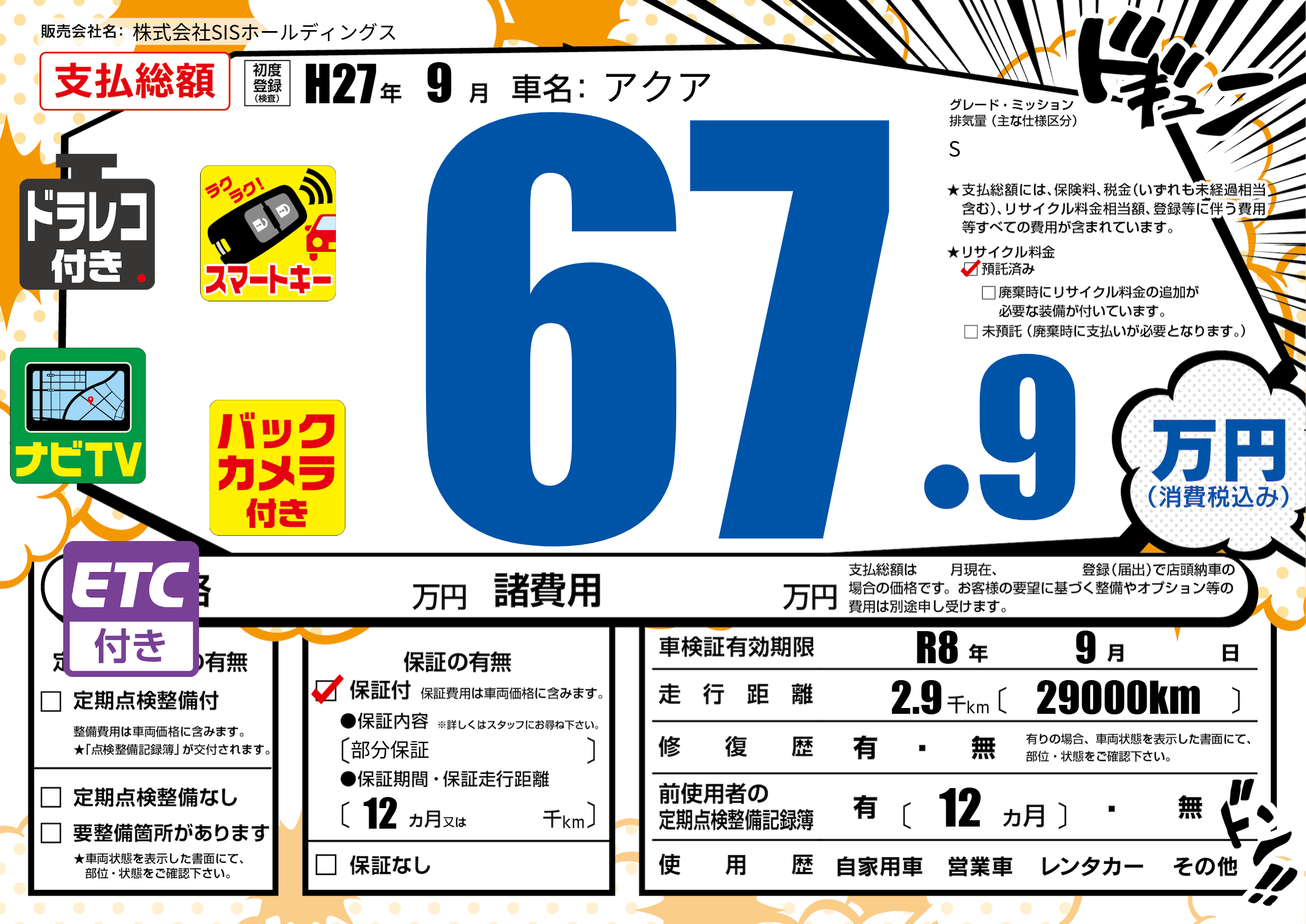 | 走行キロ | 0.2万km | 初年度登録 | H27年9月 |