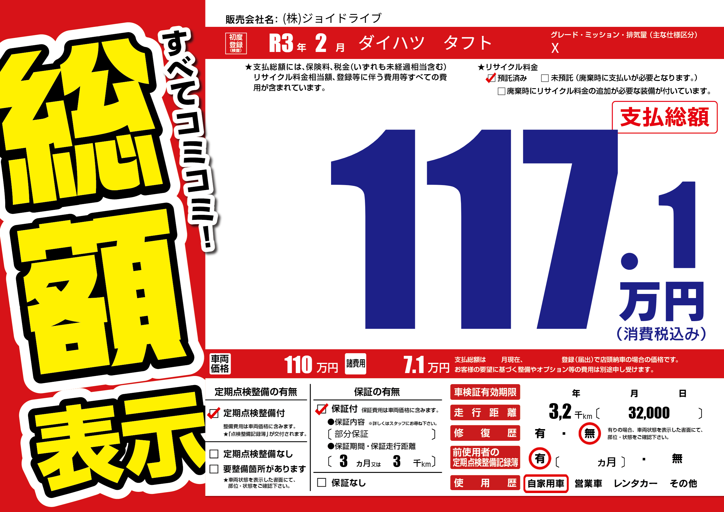 保証付き 保証内容(部分保証) 3ヶ月または(3)千kmまで |