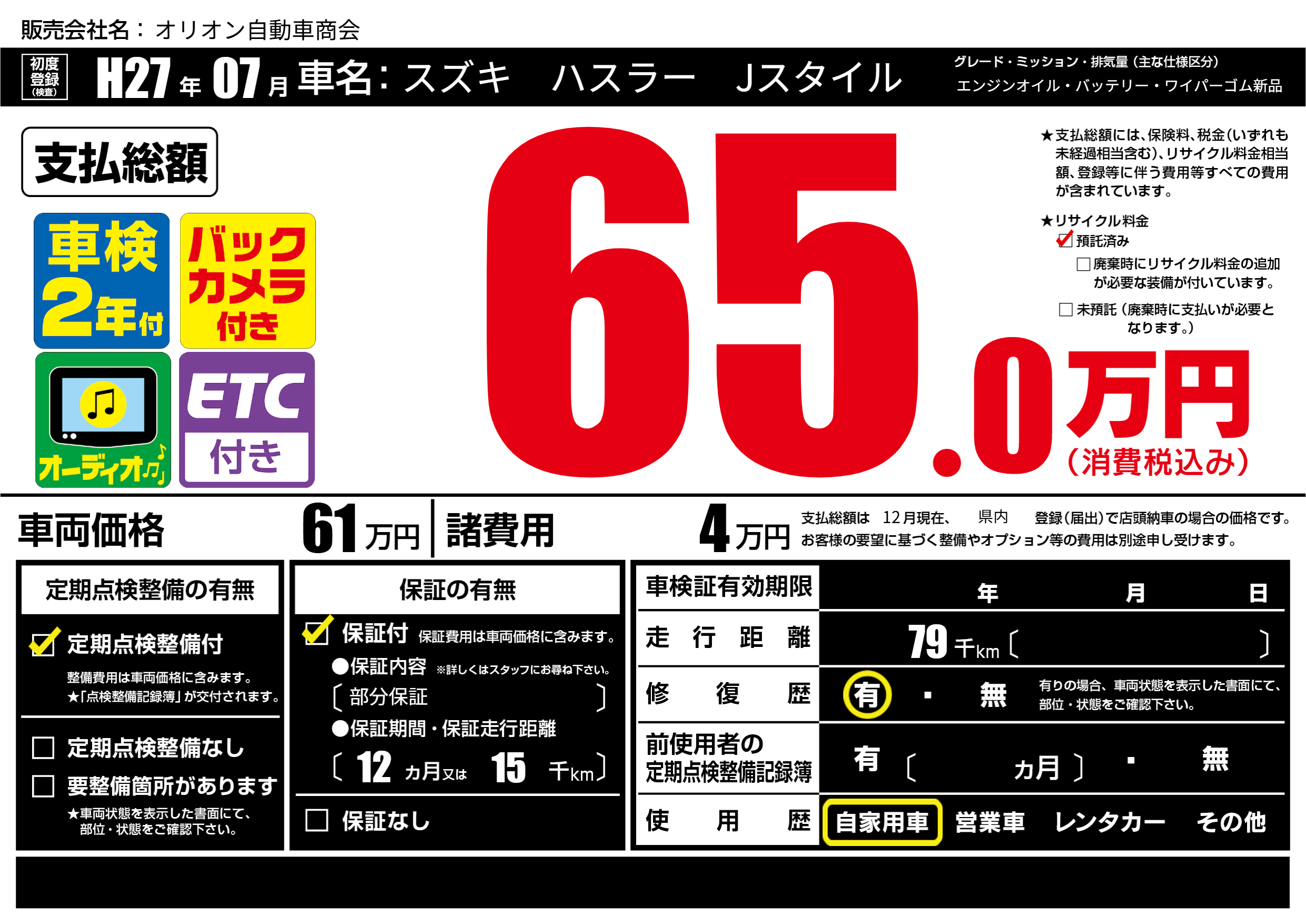 | 車名 | スズキ ハスラー Jスタイル | グレード ミッション 排気量 |