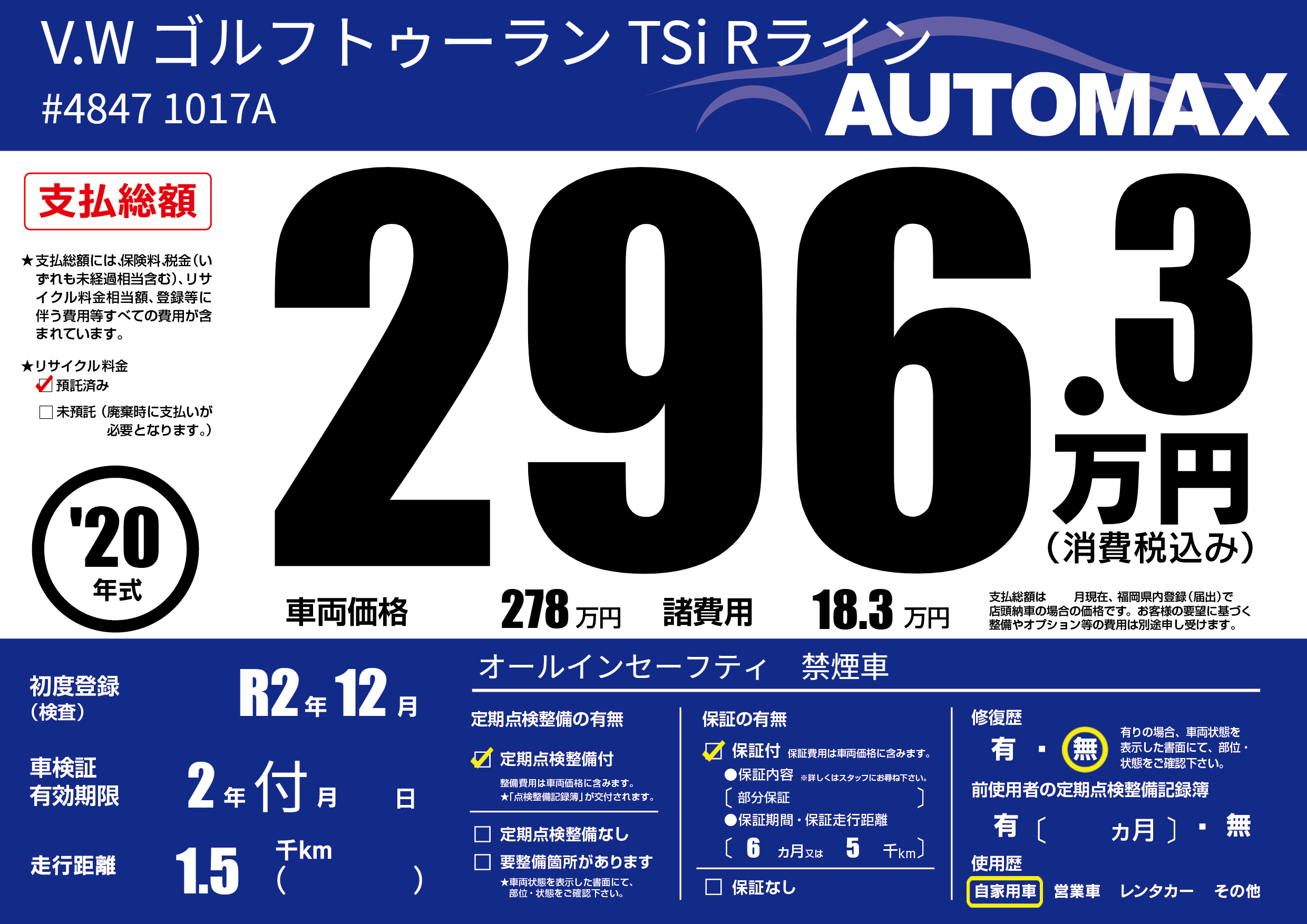 | 車名 | V.W ゴルフトゥーラン TSi Rライン | グレード ミッション 排気量 |