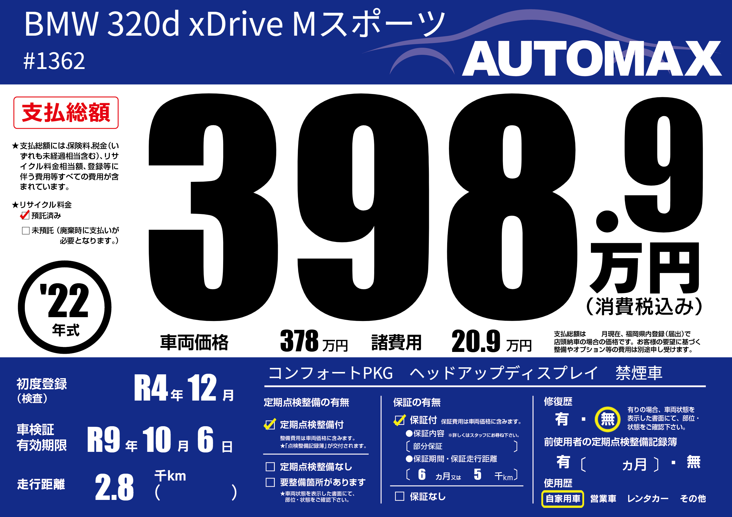 | 車名 | BMW 320d xDrive Mスポーツ | グレード ミッション 排気量 |