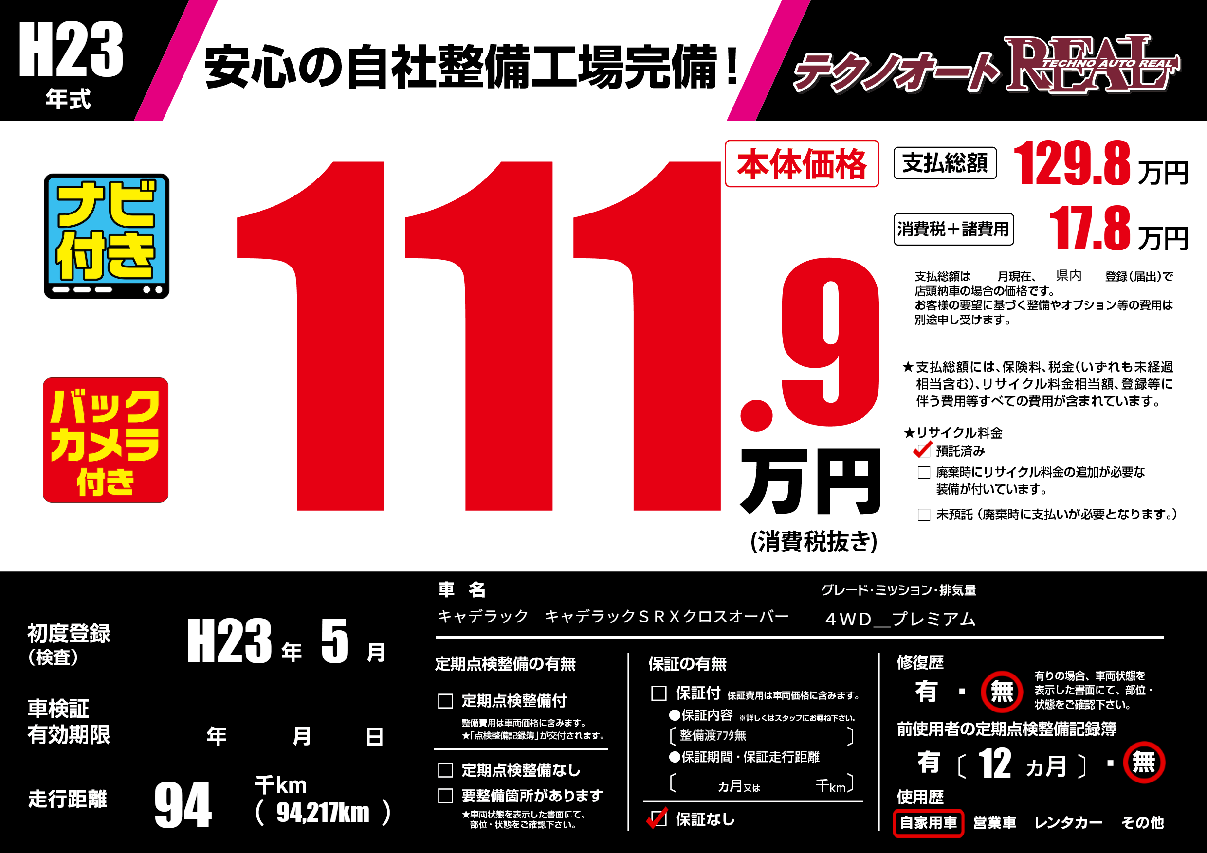 | 走行キロ | 9.4万km | 初年度登録 | H23年5月 |