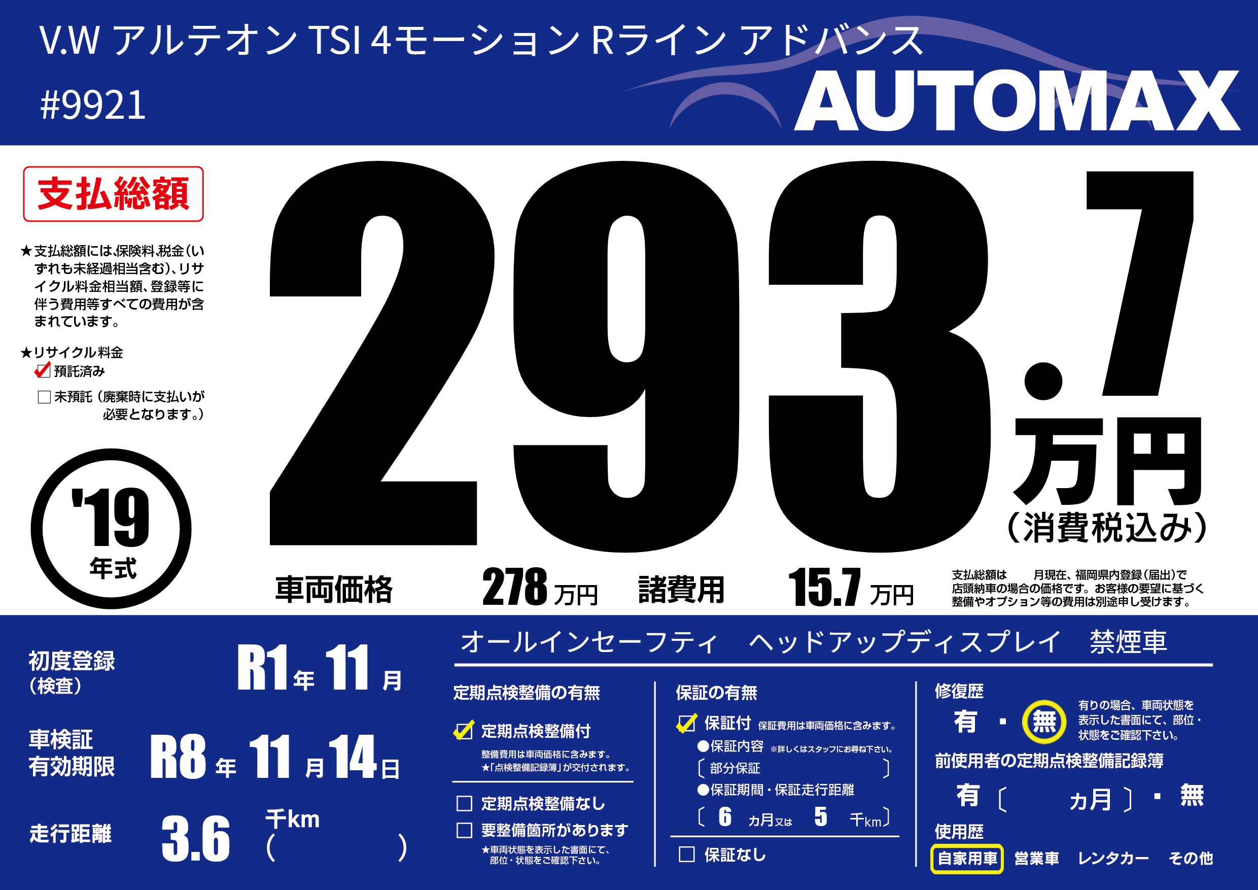 | 車名 | V.W アルテオン TSI 4モーション Rライン アドバンス | グレード ミッション 排気量 |