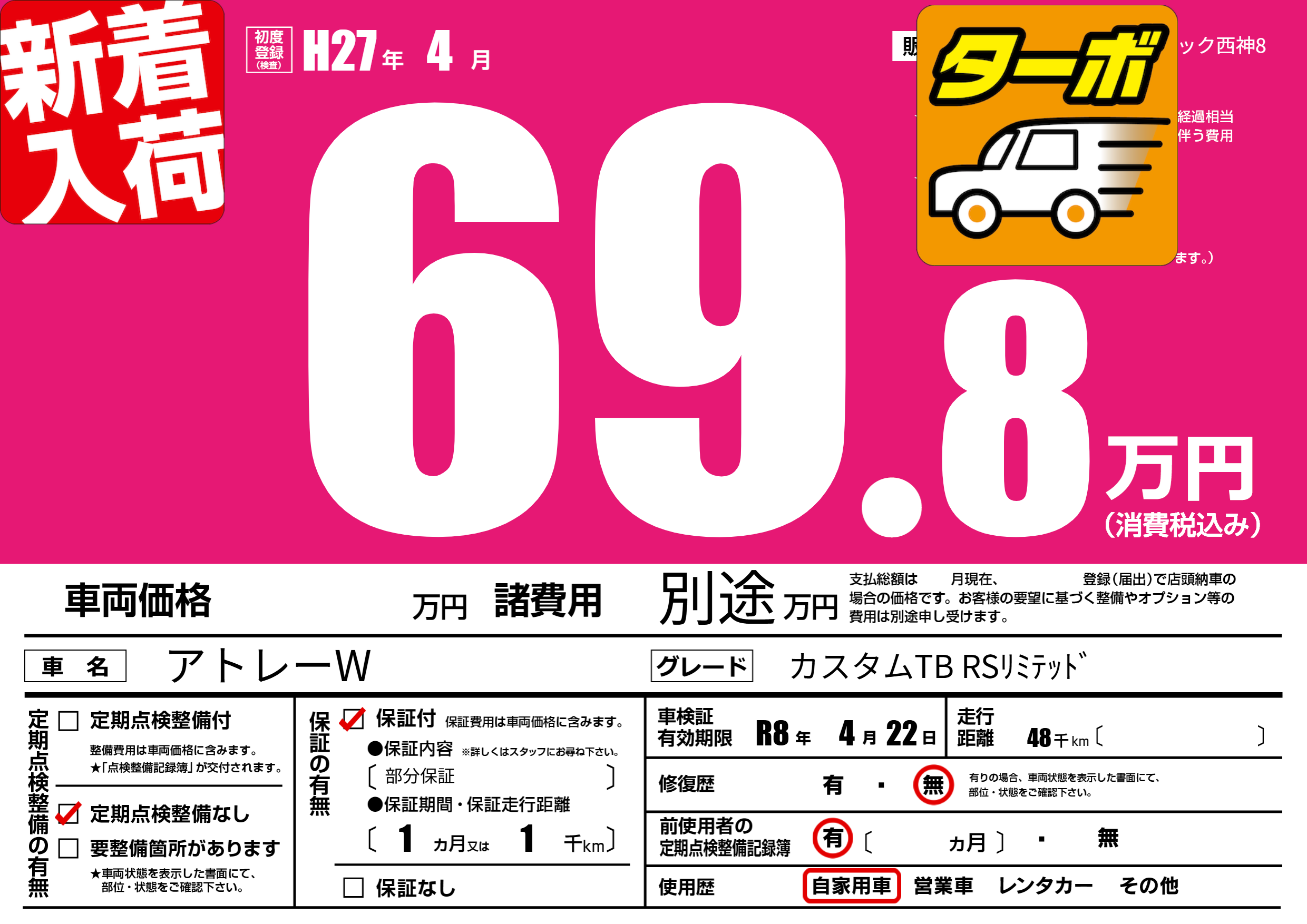 | 走行キロ | 4.8万km | 初年度登録 | H27年4月 |
