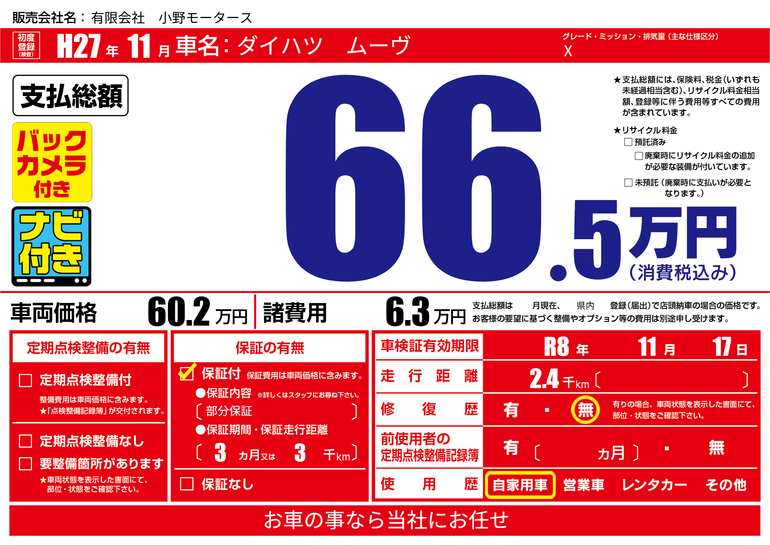 | 走行キロ | 0.2万km | 初年度登録 | H27年11月 |