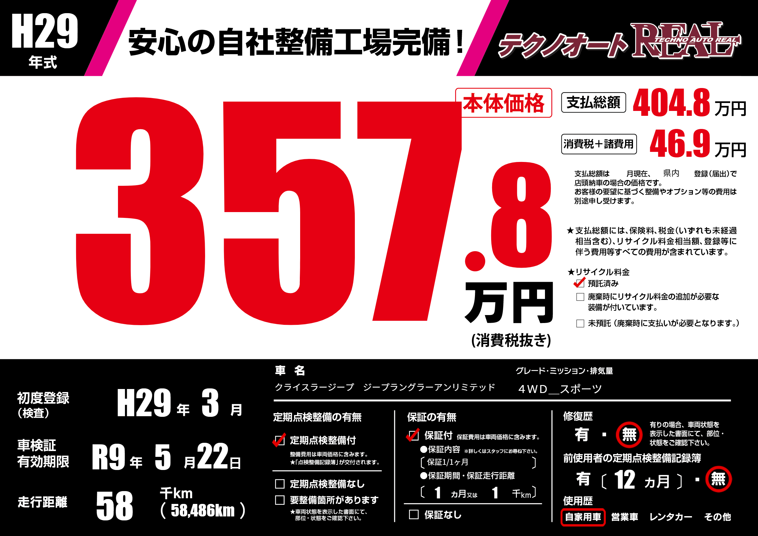 | 走行キロ | 5.8万km | 初年度登録 | H29年3月 |