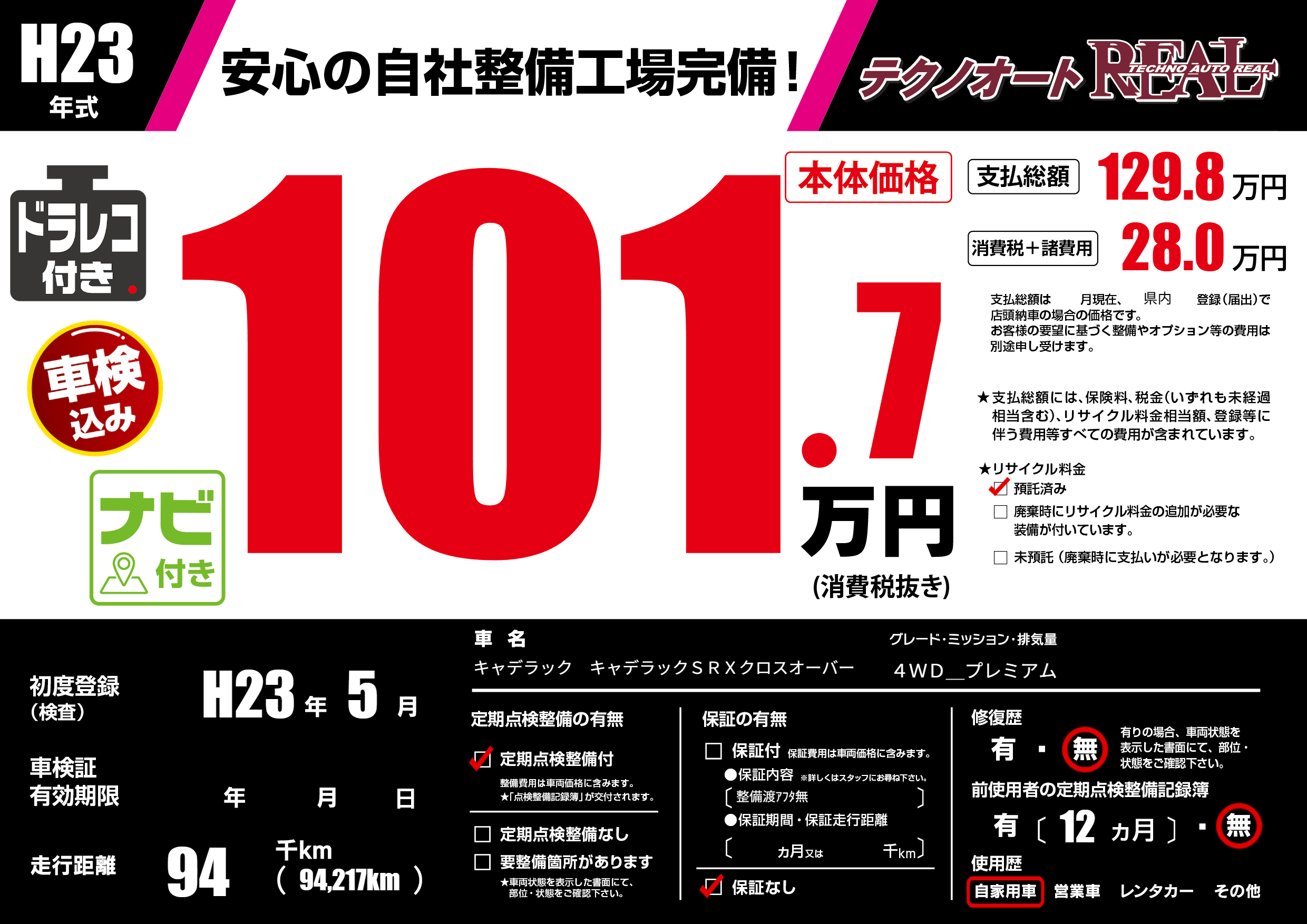 | 走行キロ | 9.4万km | 初年度登録 | H23年5月 |