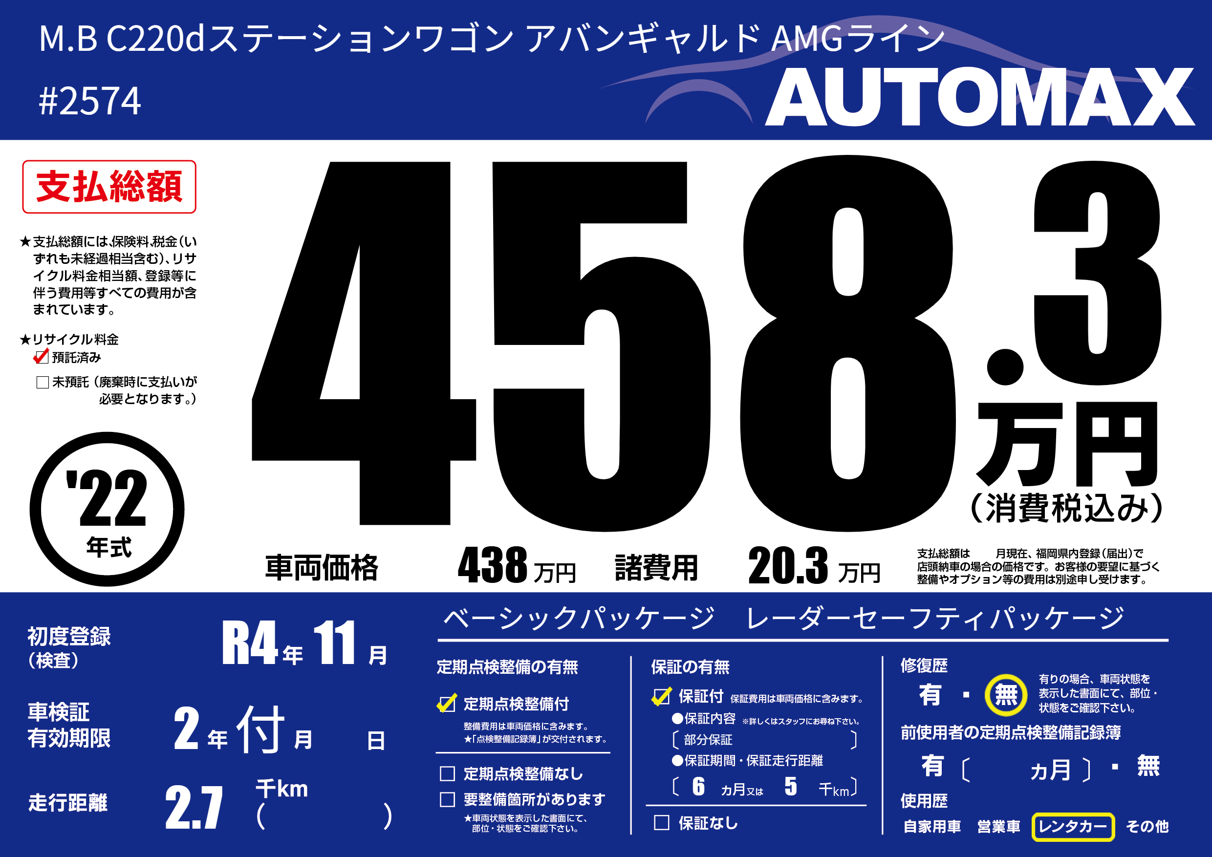 | 車名 | M.B C220dステーションワゴン アバンギャルド AMGライン | グレード ミッション 排気量 |