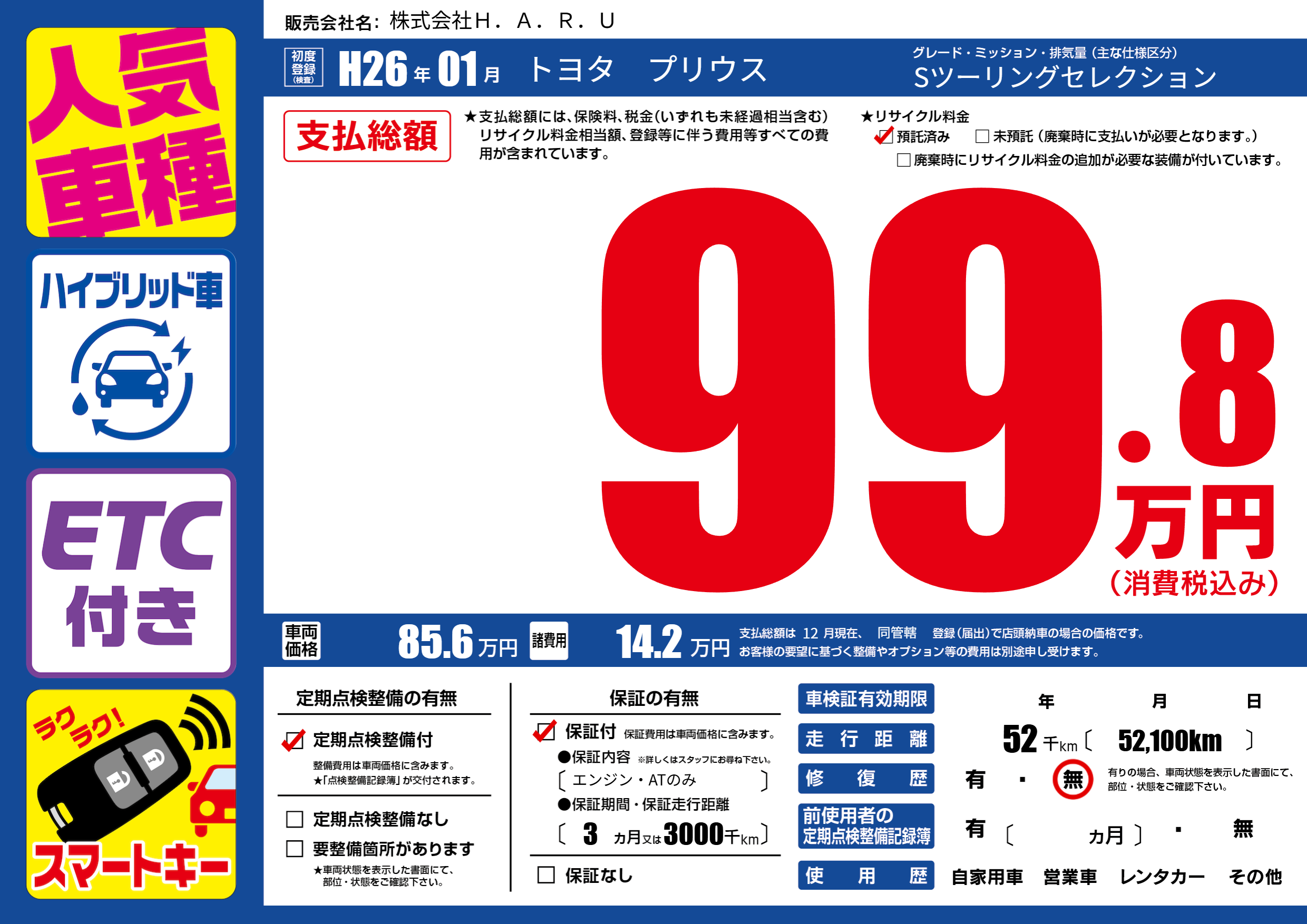 | 車名 | トヨタ プリウス | グレード ミッション 排気量 |