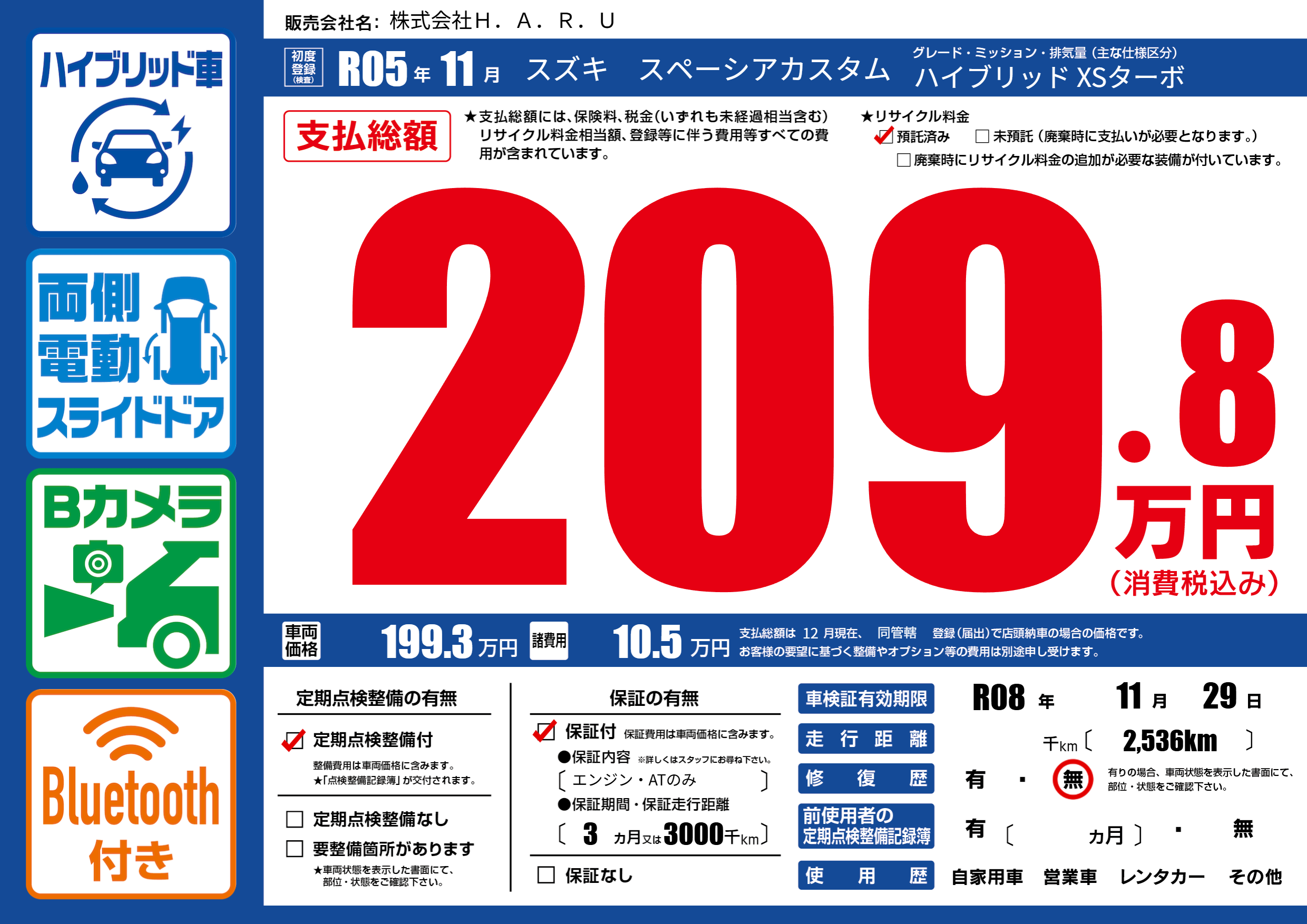 | 車名 | スズキ スペーシアカスタム | グレード ミッション 排気量 |