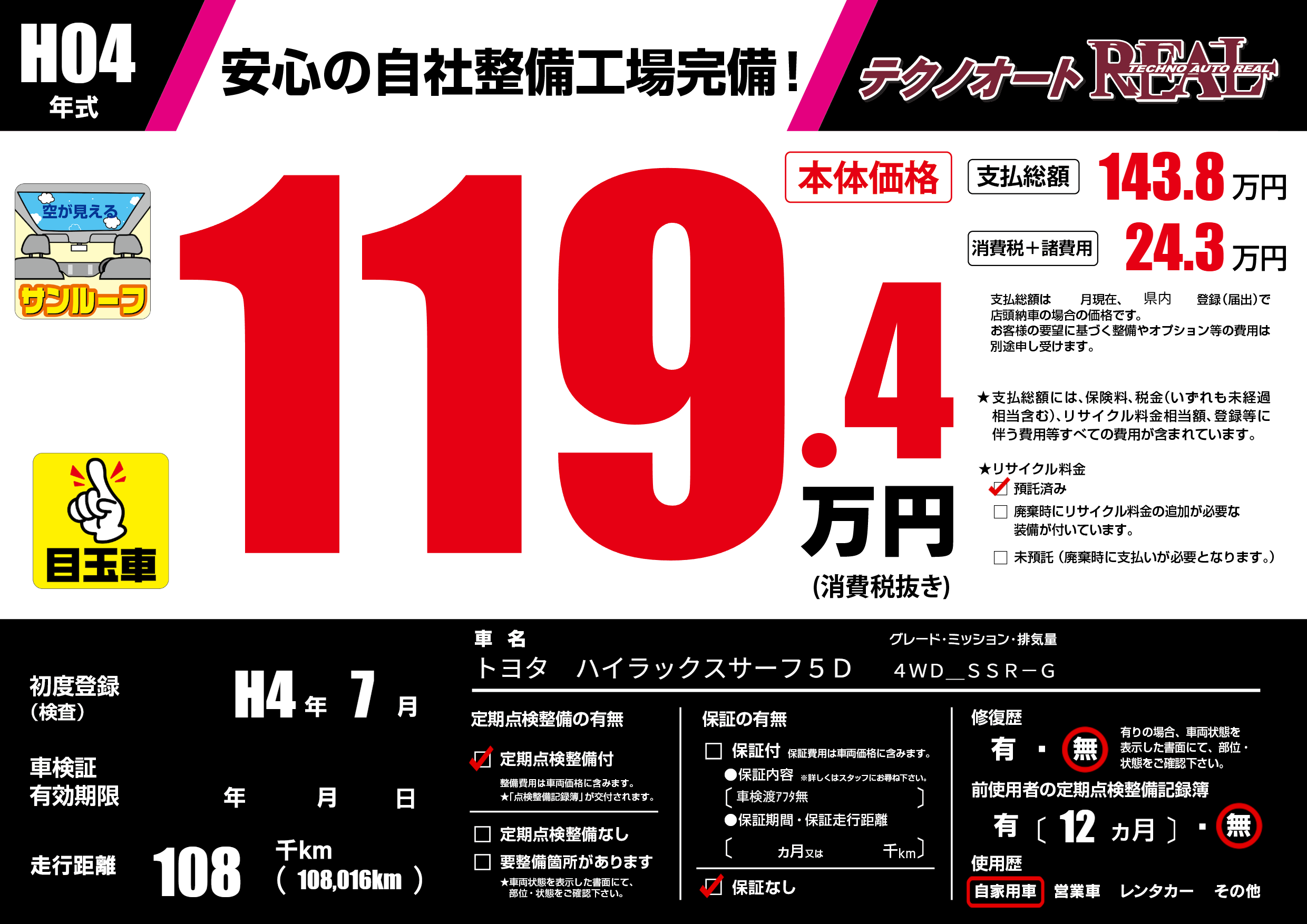 | 走行キロ | 10.8万km | 初年度登録 | H4年7月 |