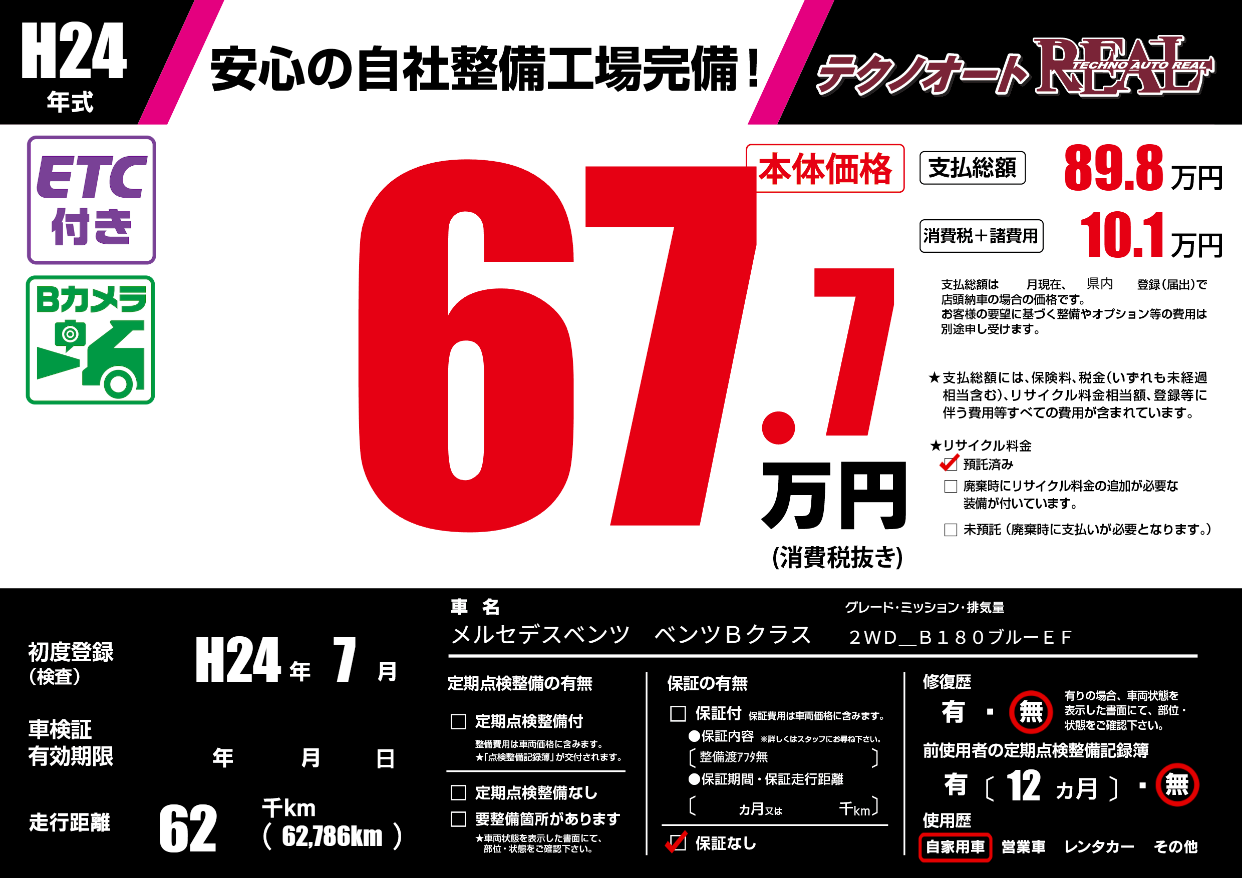 | 車名 | メルセデスベンツ ベンツBクラス | グレード ミッション 排気量 |