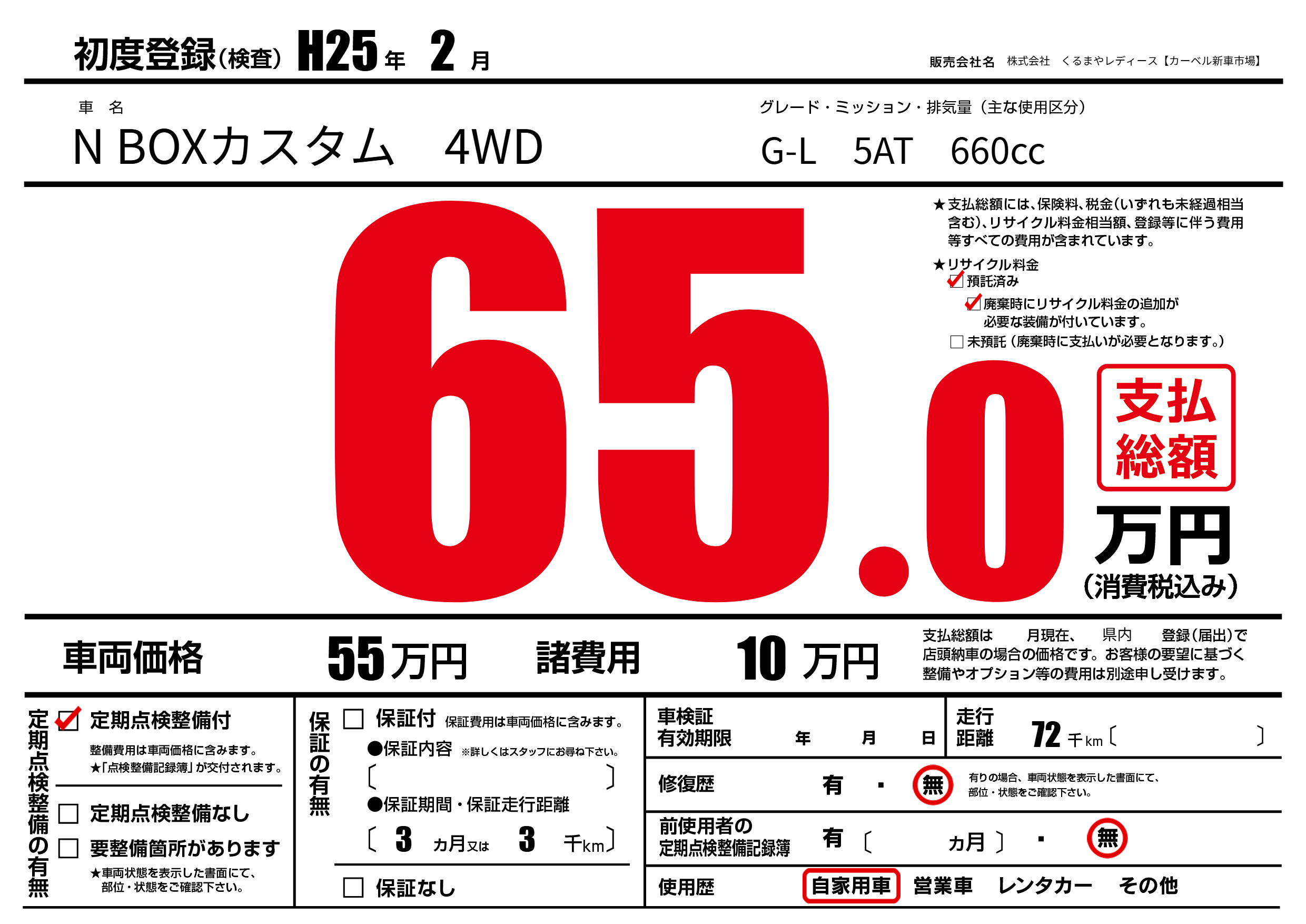 | 車名 | N BOXカスタム 4WD | グレード ミッション 排気量 |