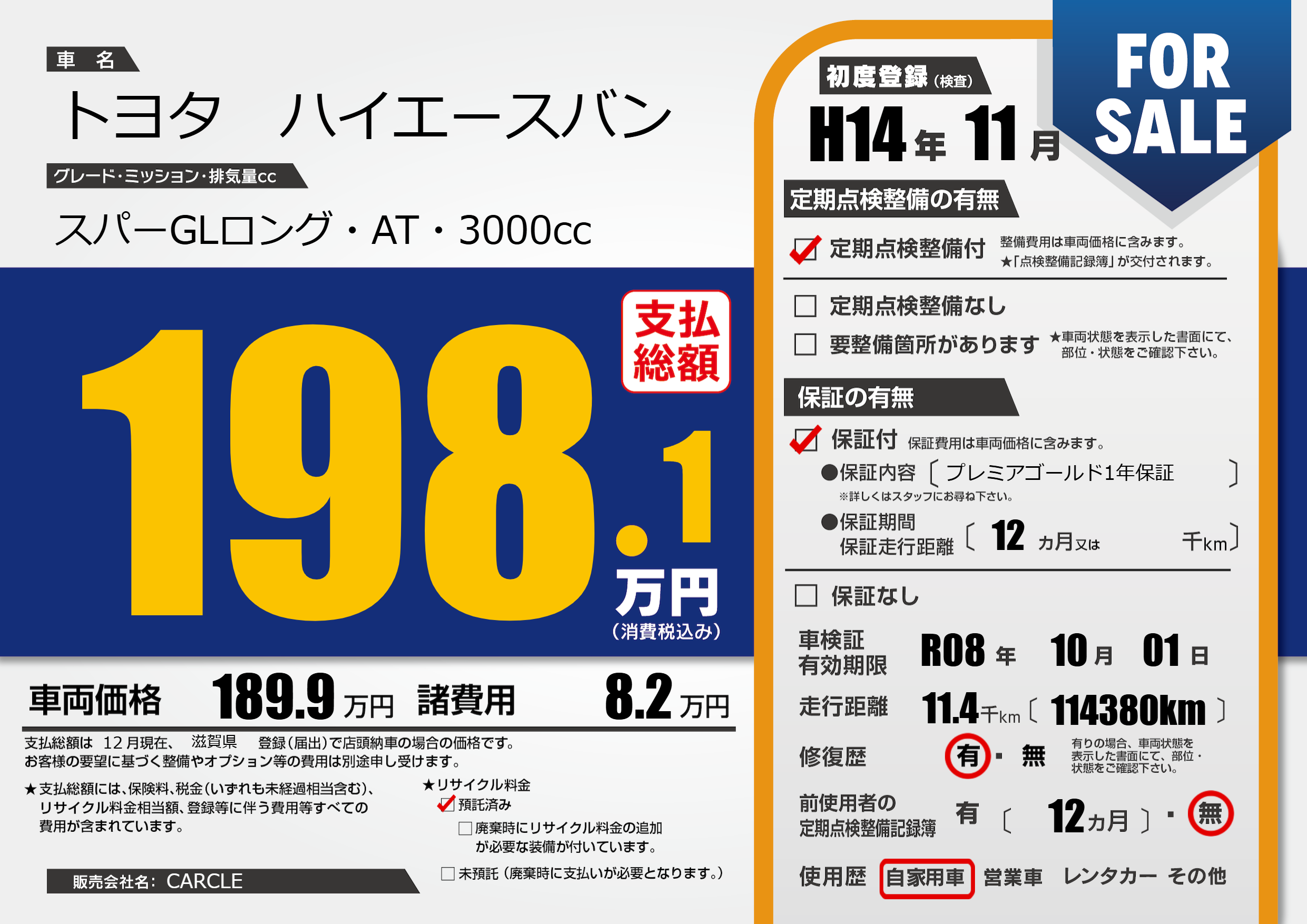 | 車名 | トヨタ ハイエースバン | グレード ミッション 排気量 |