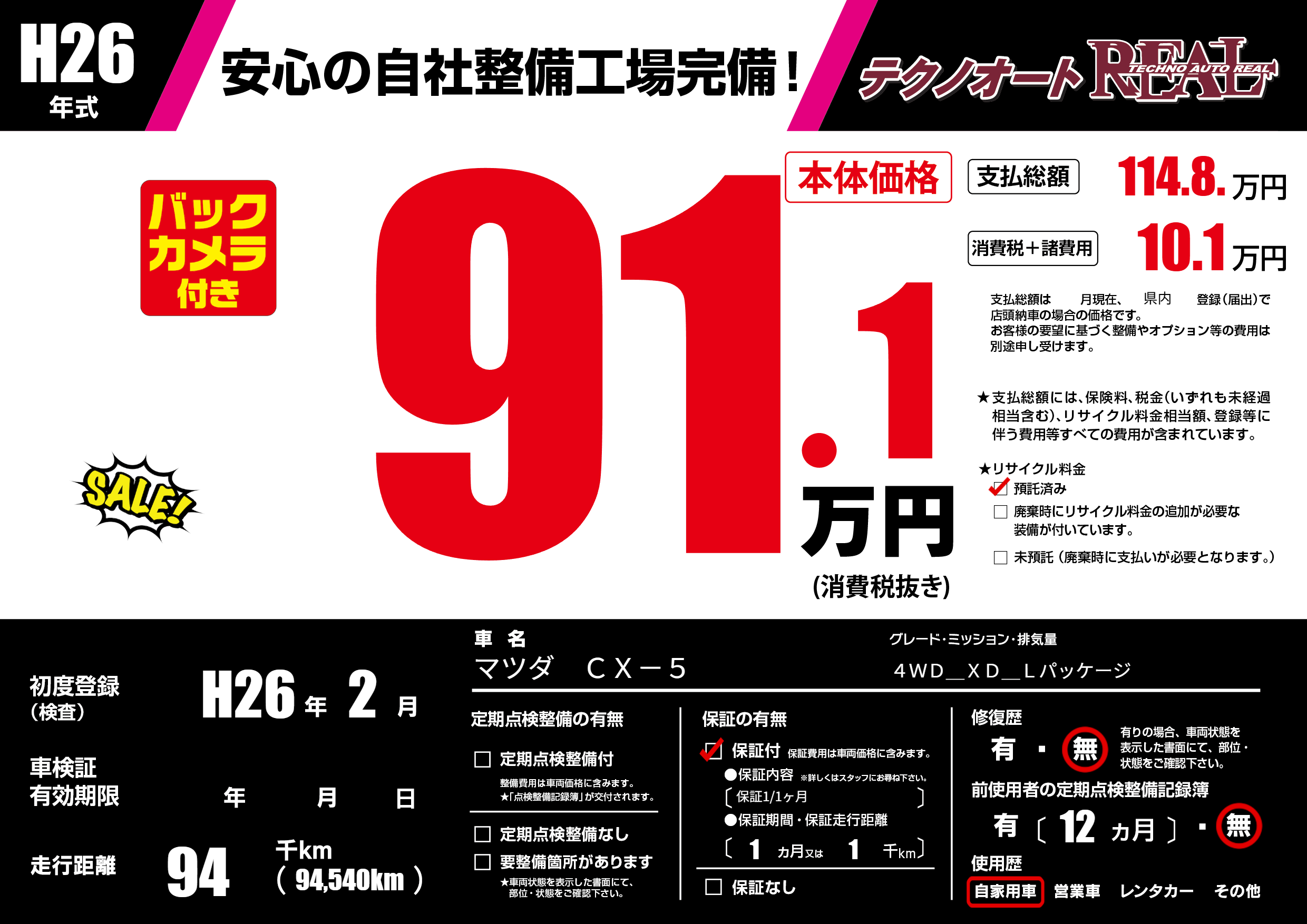 | 走行キロ | 9.4万km | 初年度登録 | H26年2月 |