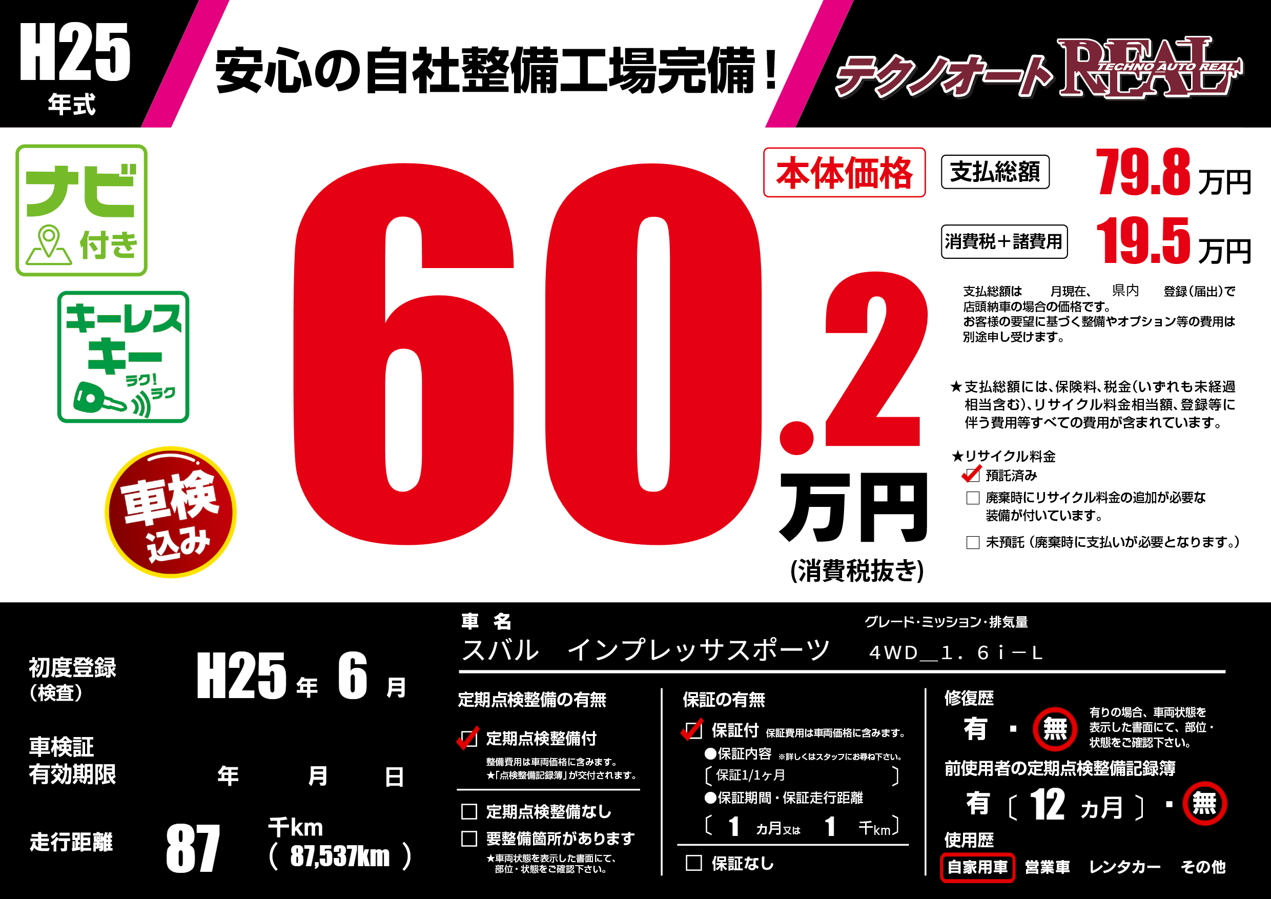 | 走行キロ | 8.7万km | 初年度登録 | H25年6月 |