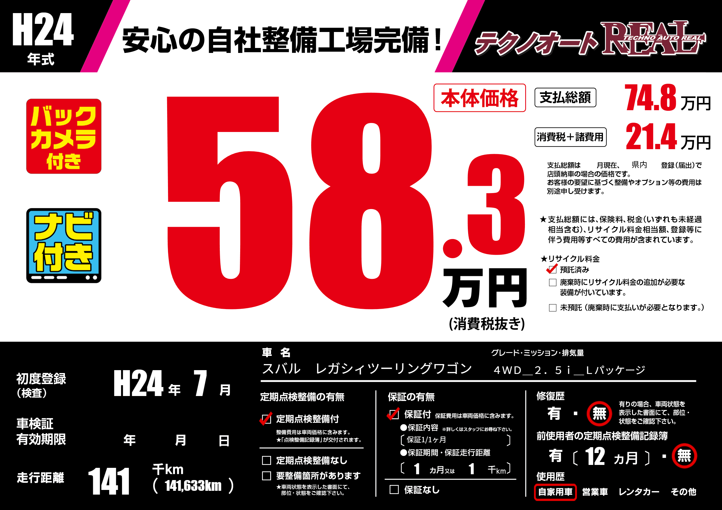 | 走行キロ | 14.1万km | 初年度登録 | H24年7月 |