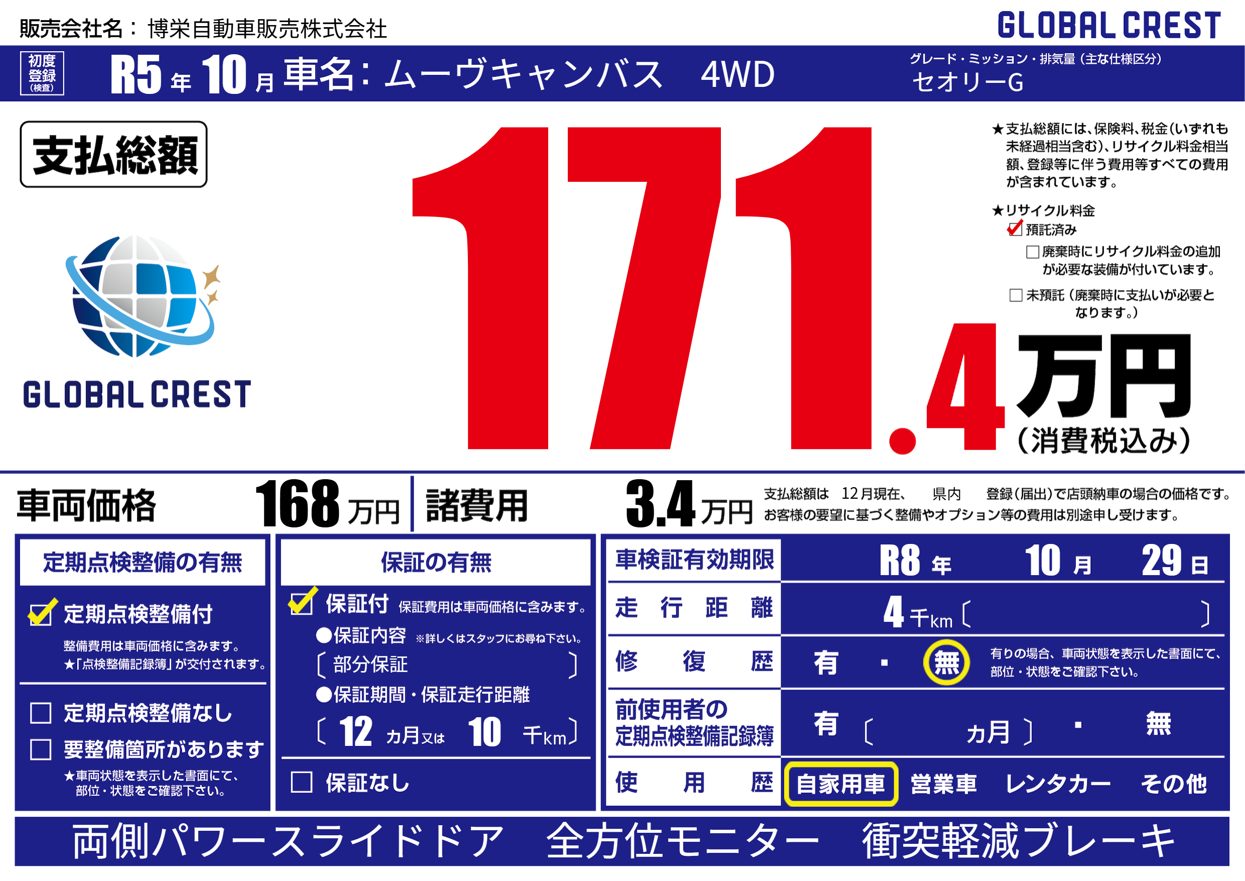 | 車名 | ムーヴキャンバス 4WD | グレード ミッション 排気量 |