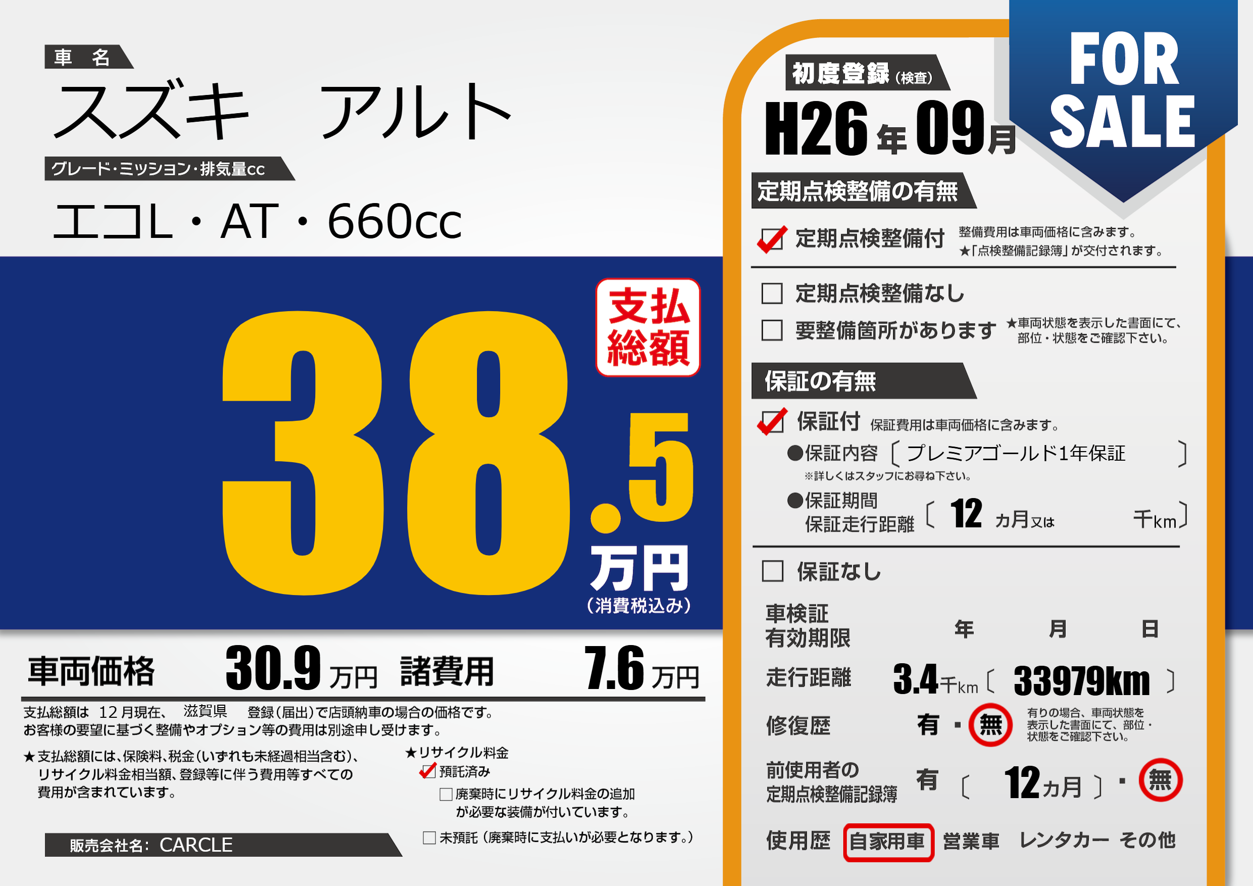 | 車名 | スズキ アルト | グレード ミッション 排気量 |