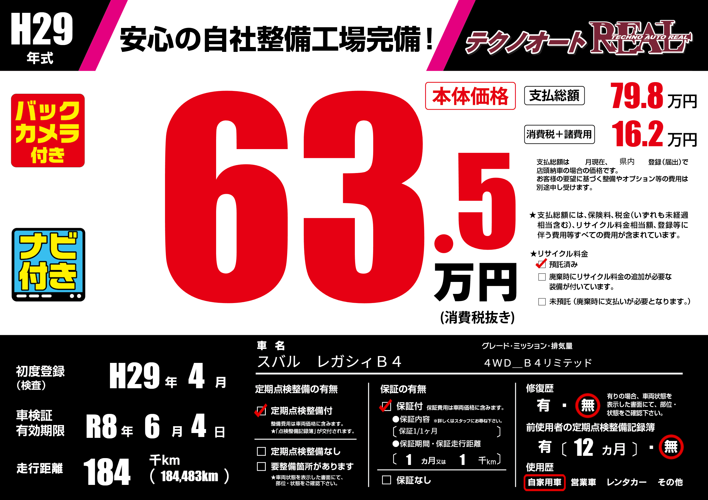 | 車名 | スバル レガシィB4 | グレード ミッション 排気量 |