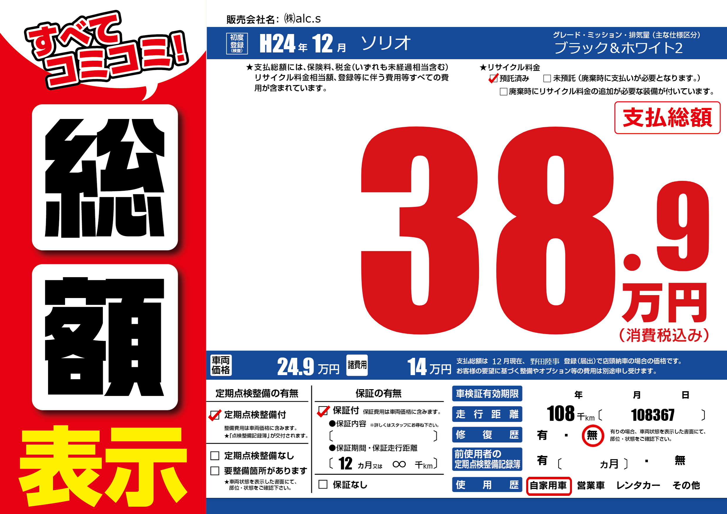 | 走行キロ | 10.8万km | 初年度登録 | H24年12月 |