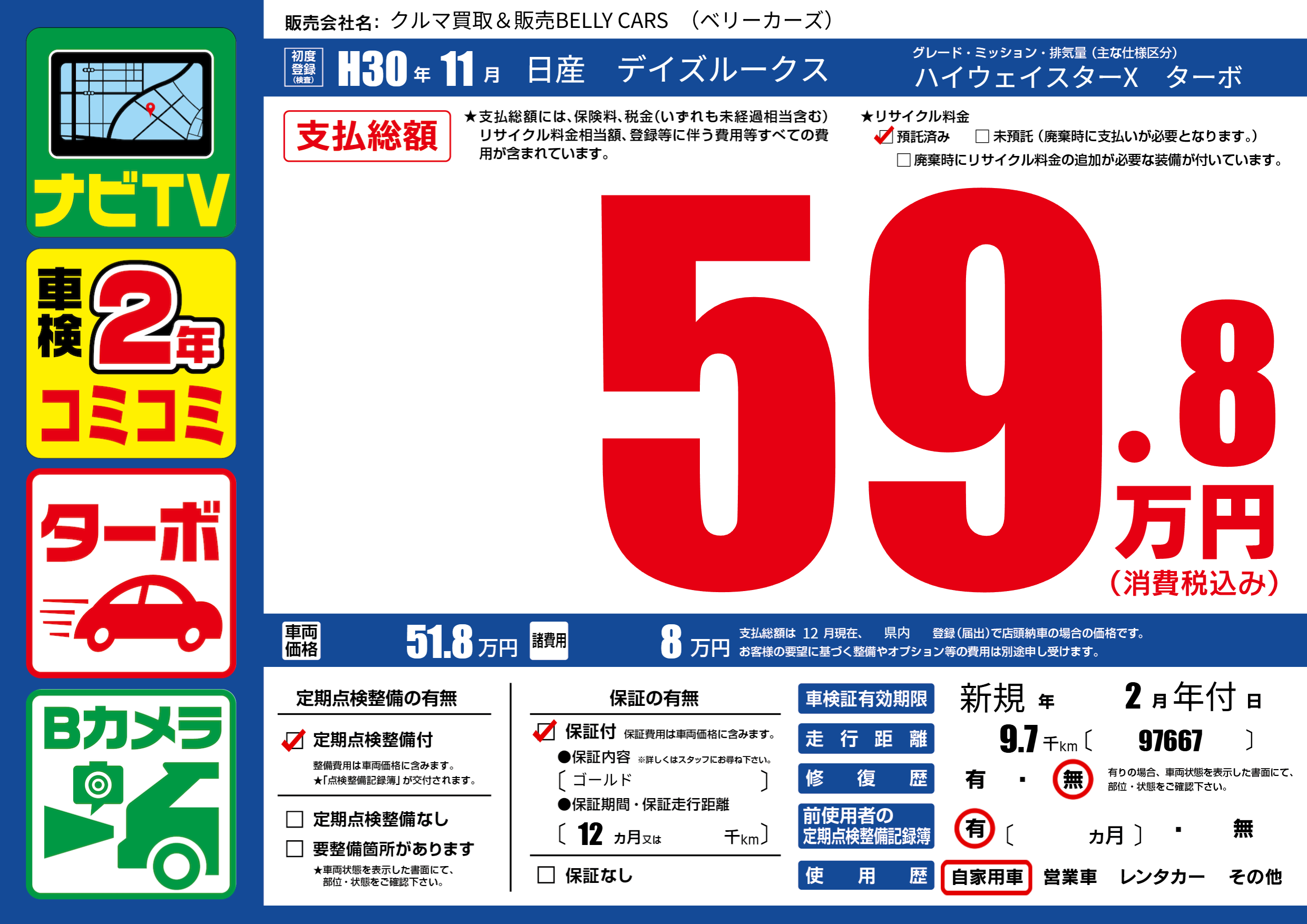 | 走行キロ | 0.9万km | 初年度登録 | H30年11月 |
