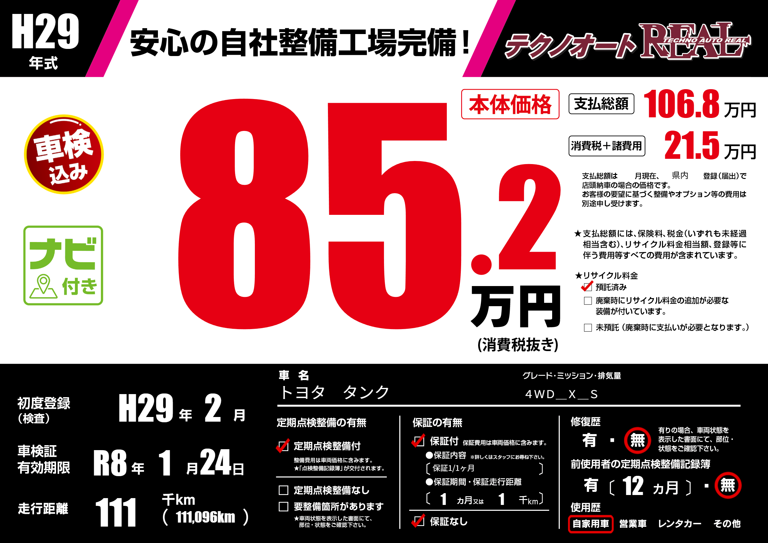 | 車名 | トヨタ タンク | グレード ミッション 排気量 |