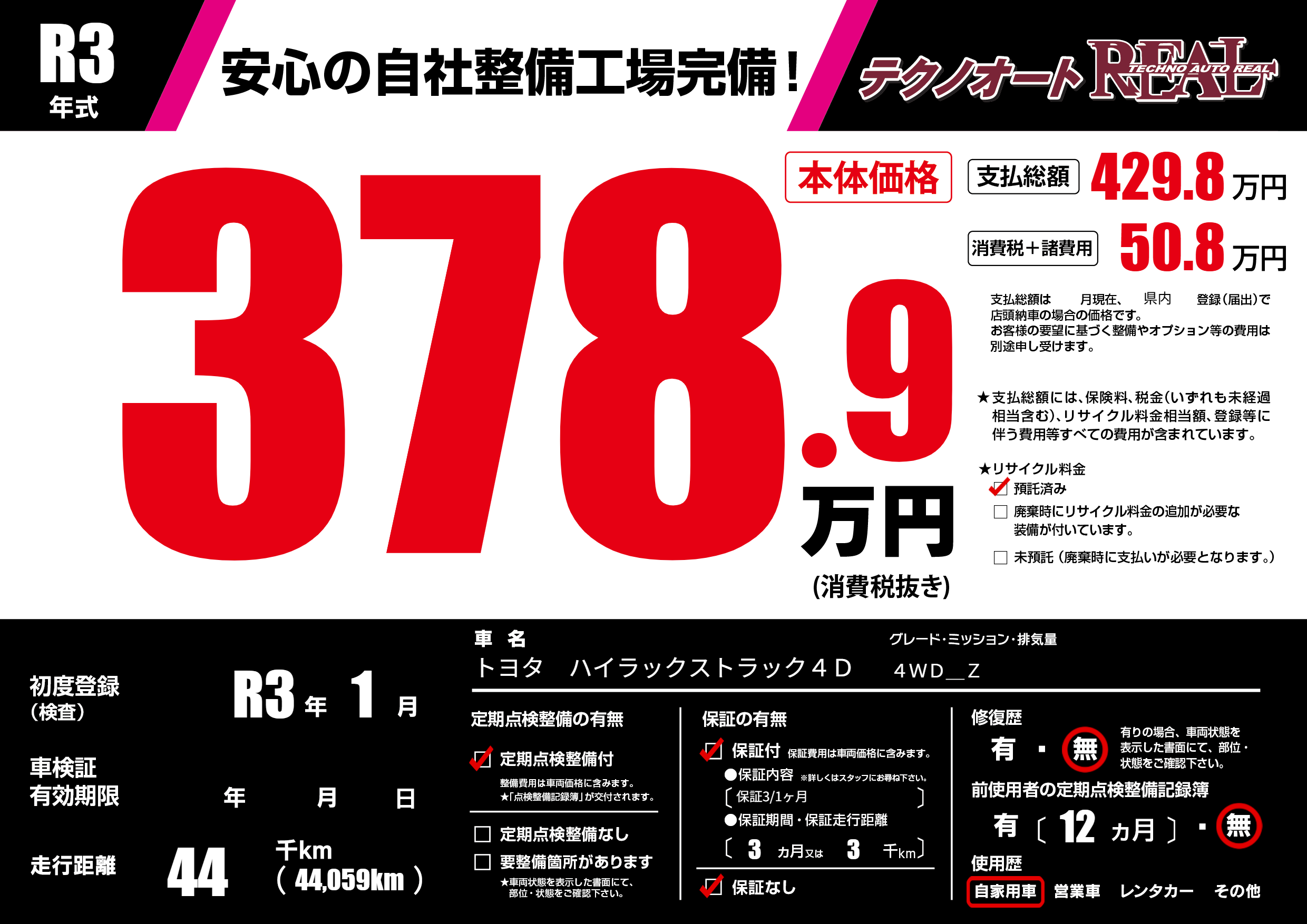 | 走行キロ | 4.4万km | 初年度登録 | R3年1月 |
