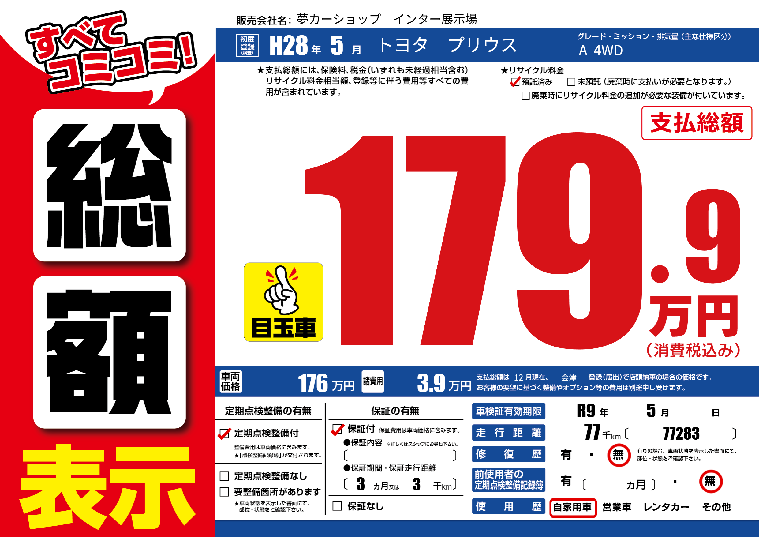 | 車名 | トヨタ プリウス | グレード ミッション 排気量 |