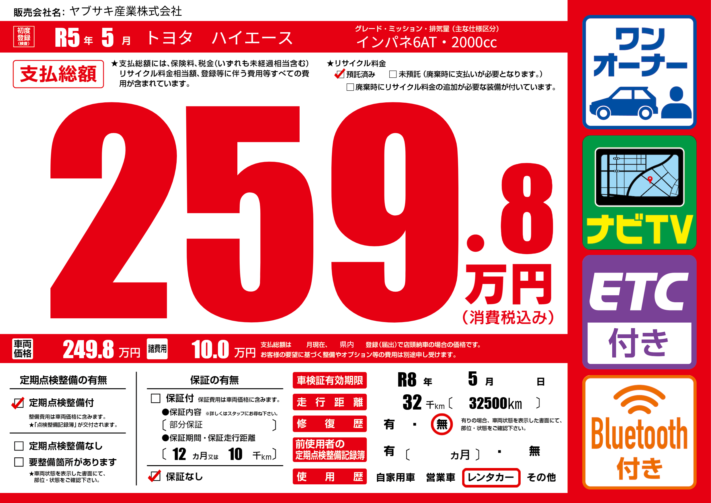 | 車名 | トヨタ ハイエース | グレード ミッション 排気量 |