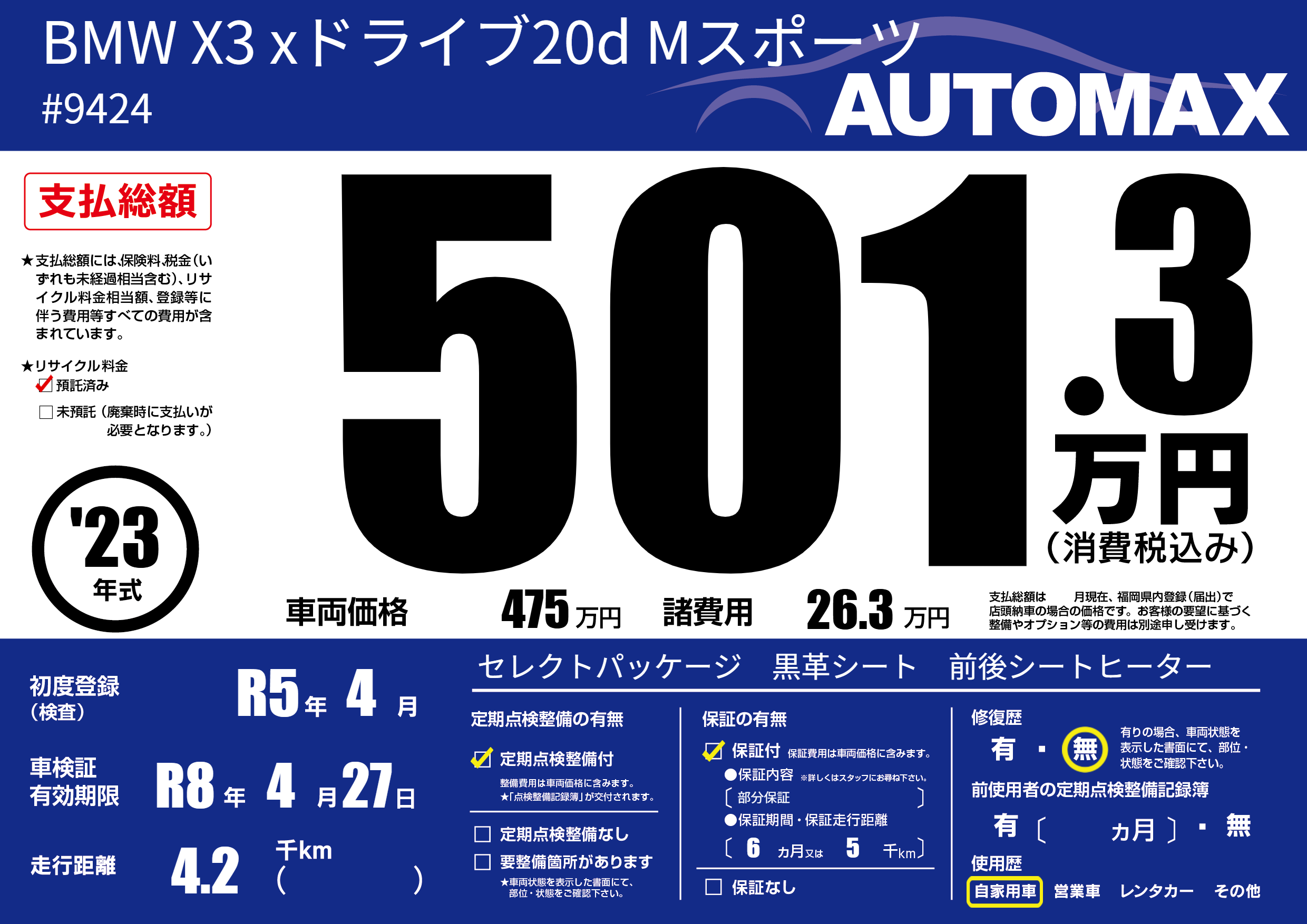 | 車名 | BMW X3 xドライブ20d Mスポーツ | グレード ミッション 排気量 |