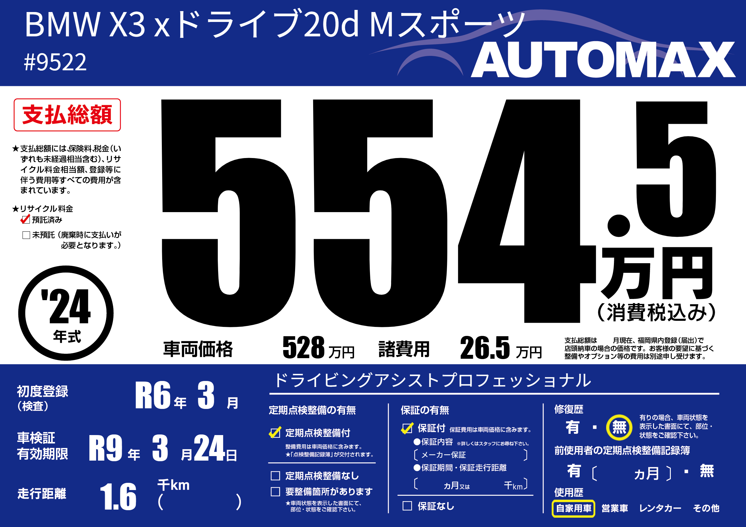 | 車名 | BMW X3 xドライブ20d Mスポーツ | グレード ミッション 排気量 |