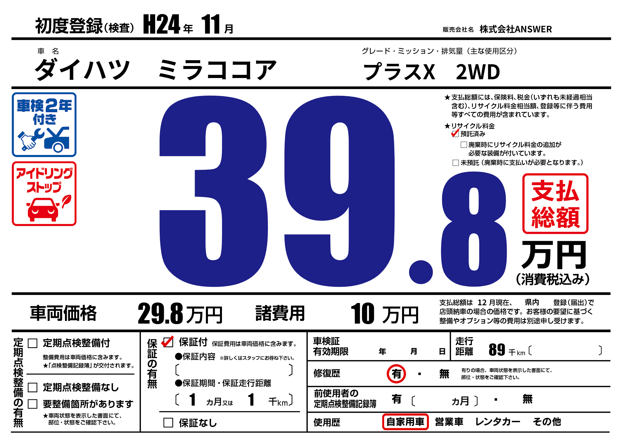 | 走行キロ | 8.9万km | 初年度登録 | H24年11月 |