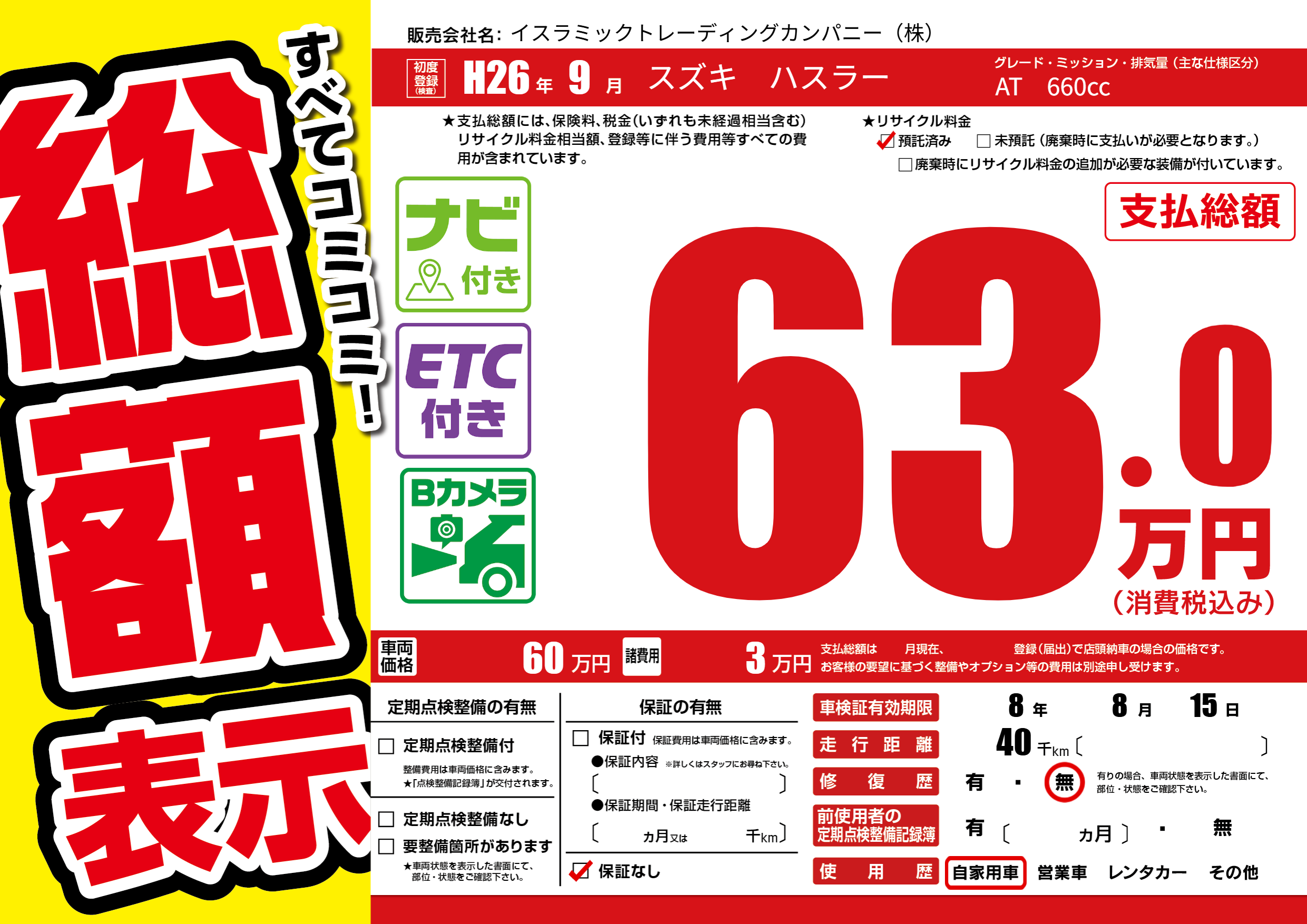| 車名 | スズキ ハスラー | グレード ミッション 排気量 |
