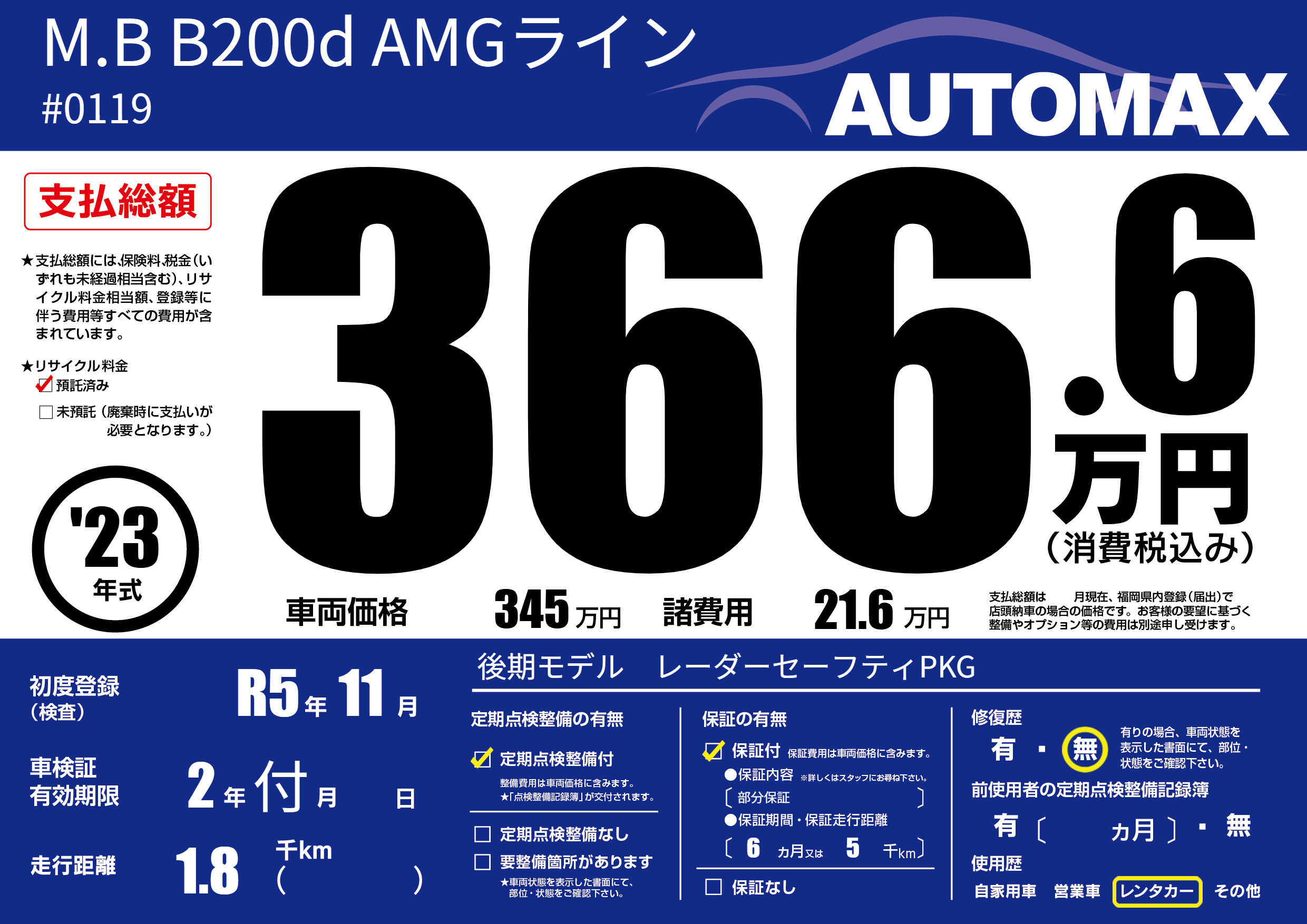 | 車名 | M.B B200d AMGライン | グレード ミッション 排気量 |