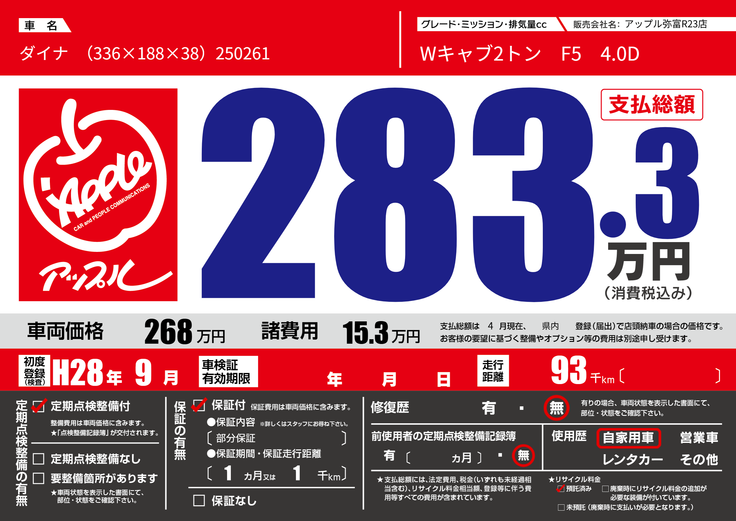 | 車名 | ダイナ (336×188×38)250261 | グレード ミッション 排気量 |