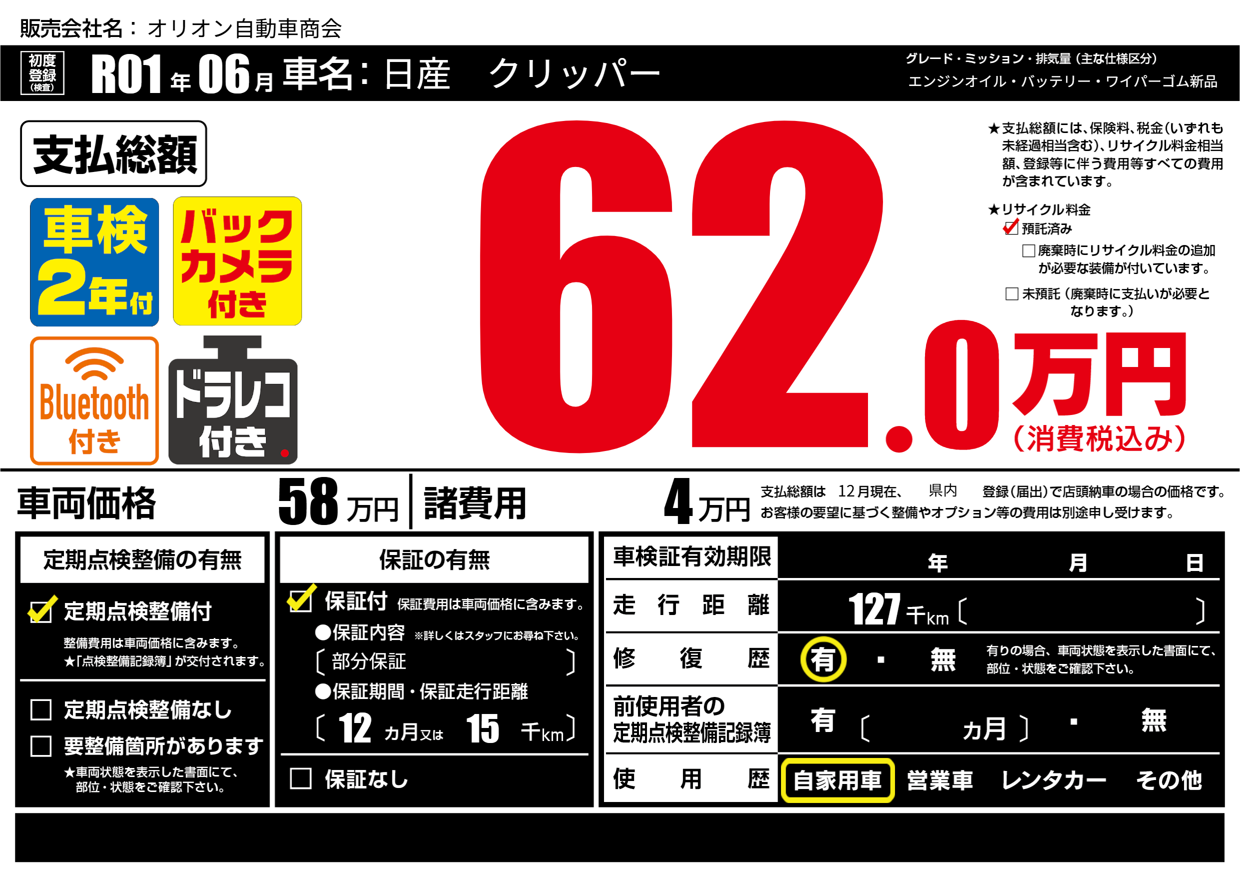保証付き 保証内容(部分保証) 12ヶ月または(15)千kmまで |