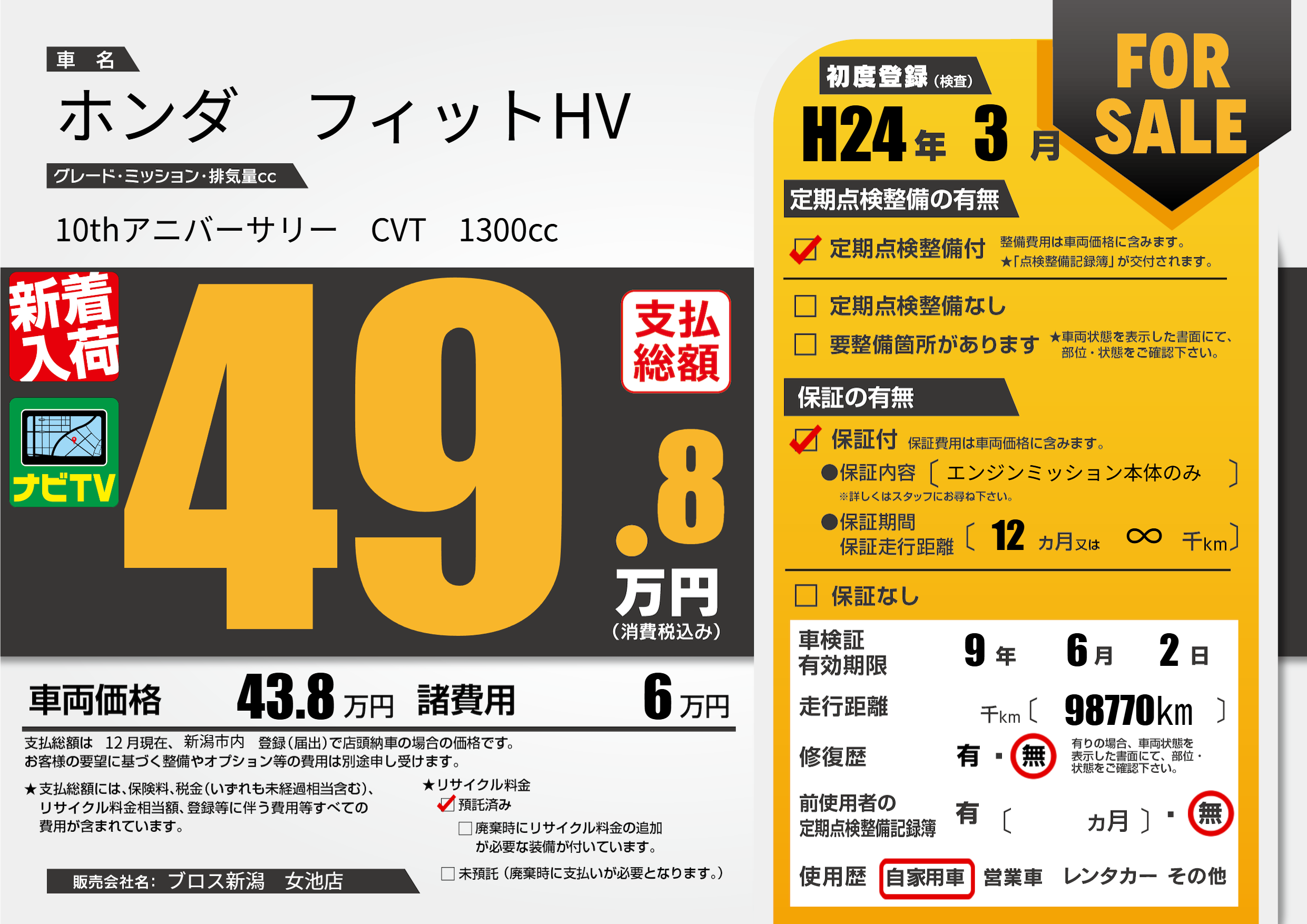 | 走行キロ | - | 初年度登録 | H24年3月 |