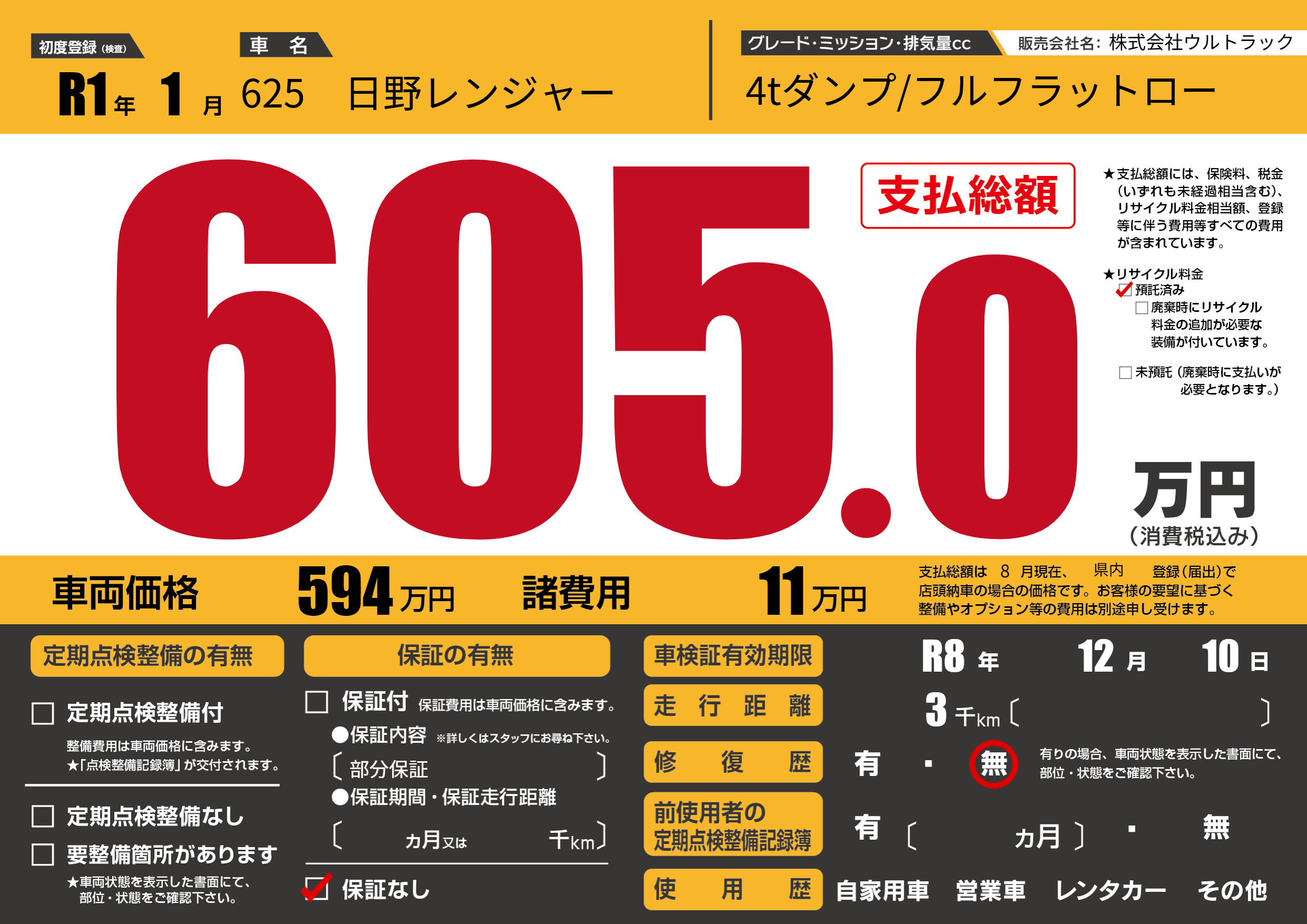 | 車名 | 625 日野レンジャー | グレード ミッション 排気量 |