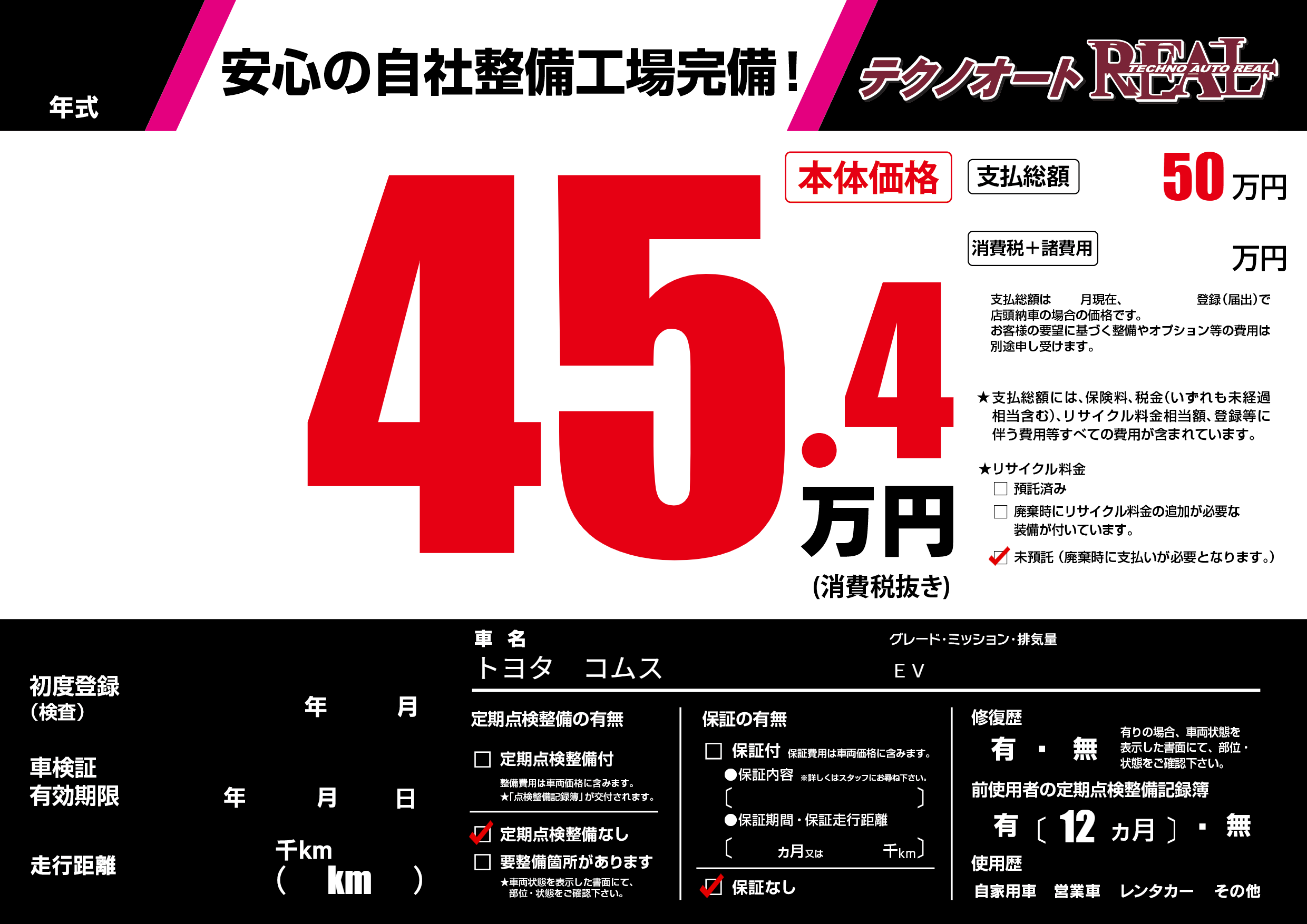 | 車名 | トヨタ コムス | グレード ミッション 排気量 |