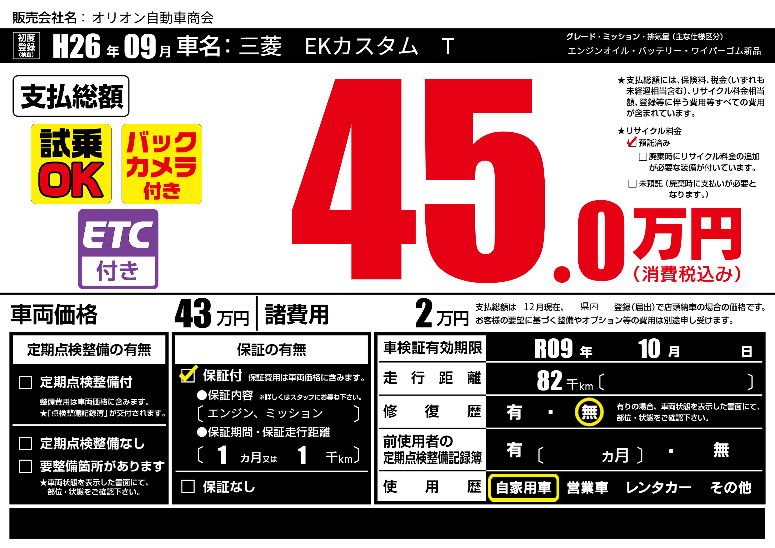 | 車名 | 三菱 EKカスタム T | グレード ミッション 排気量 |