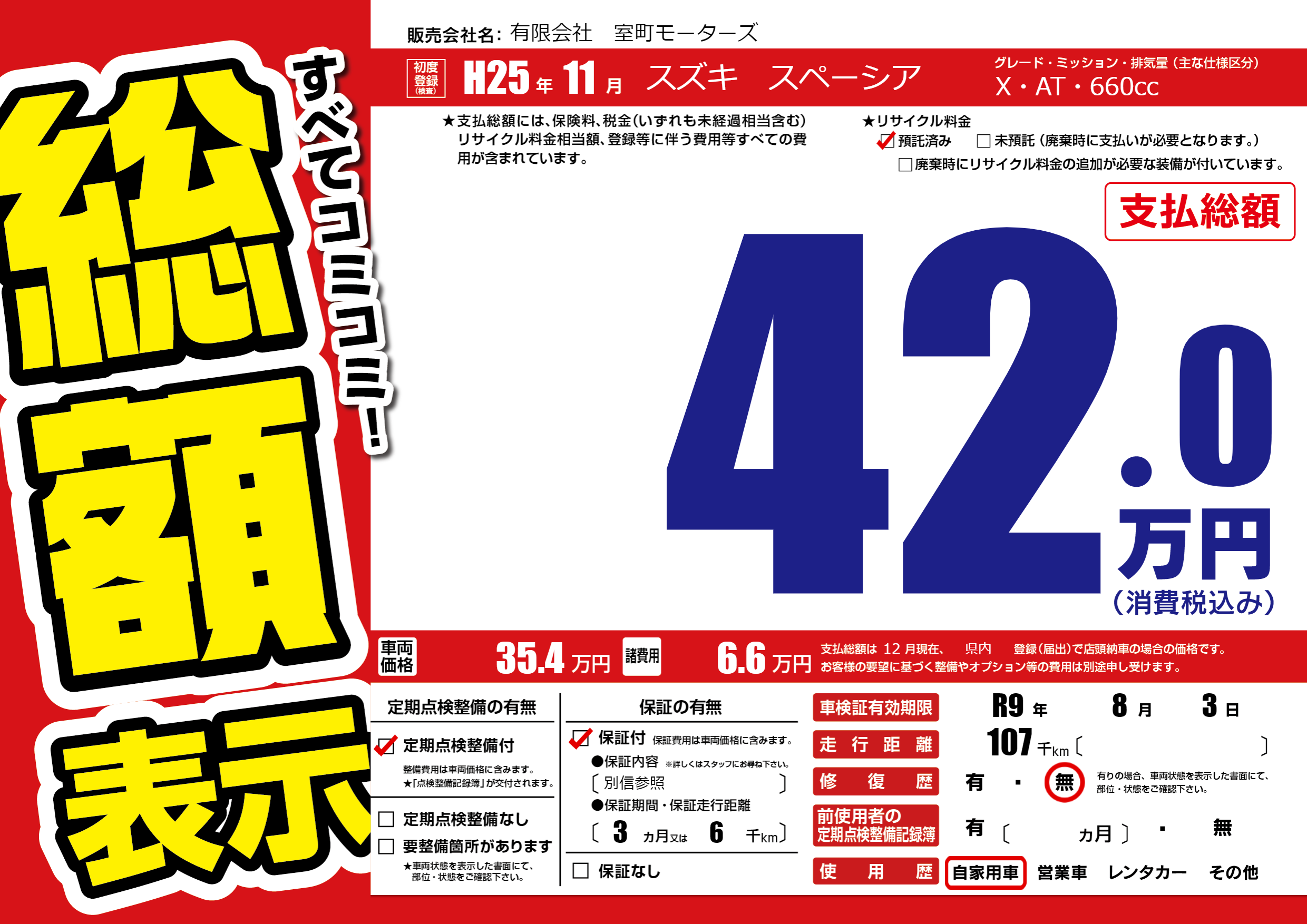 | 車名 | スズキ スペーシア | グレード ミッション 排気量 |