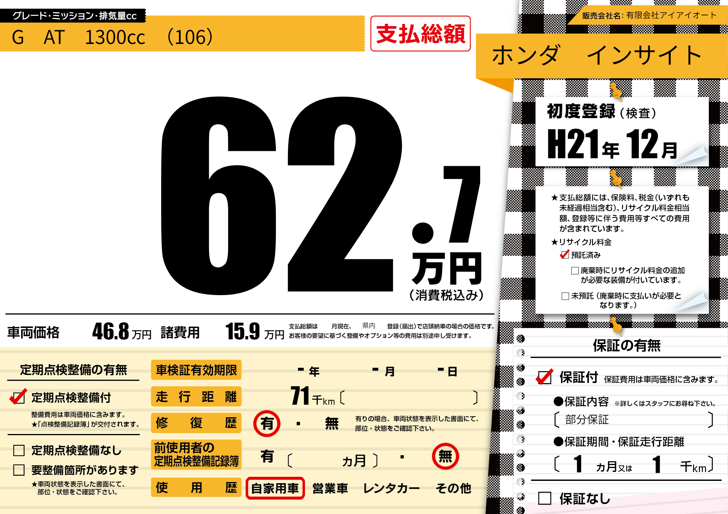 | 車名 | ホンダ インサイト | グレード ミッション 排気量 |