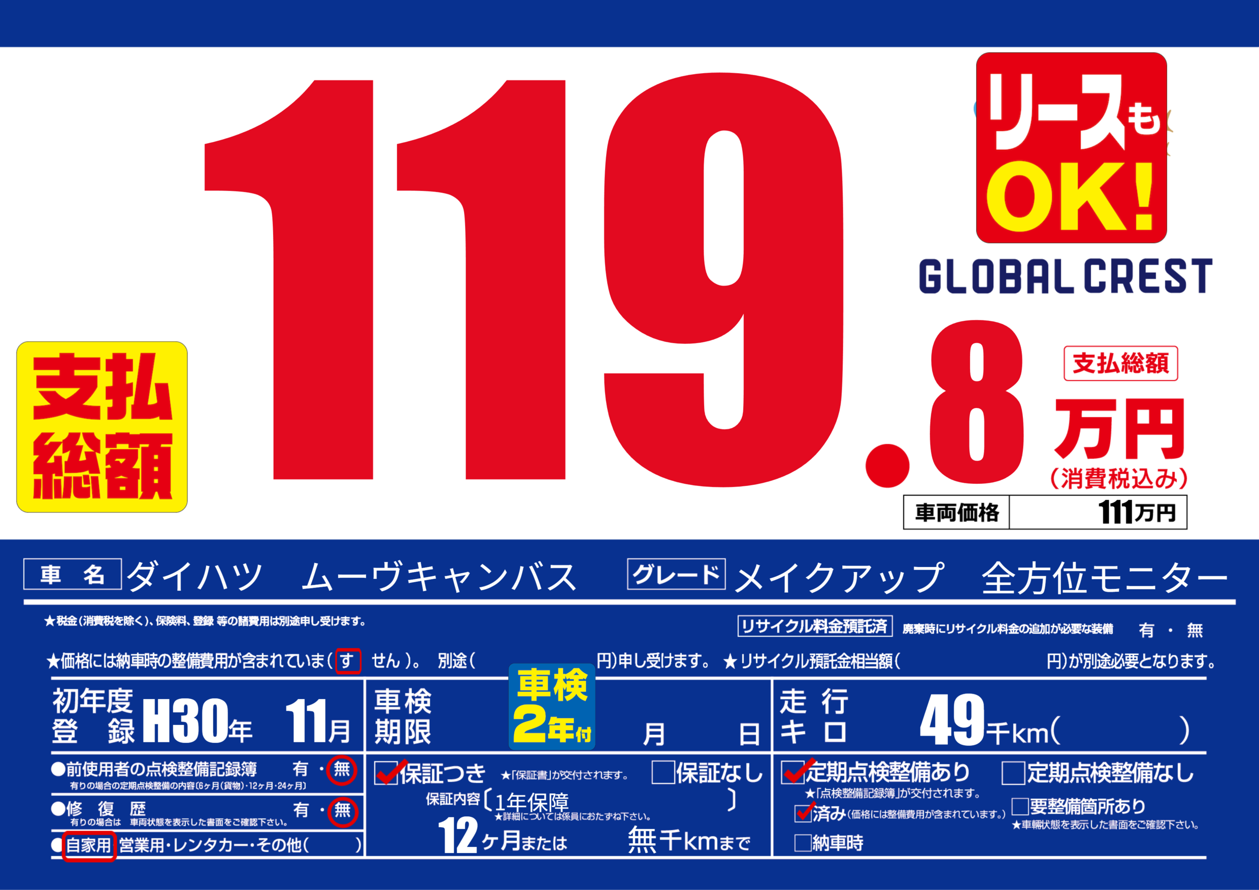 | 定期点検整備 | 定期点検整備あり 定期点検整備済み | ||