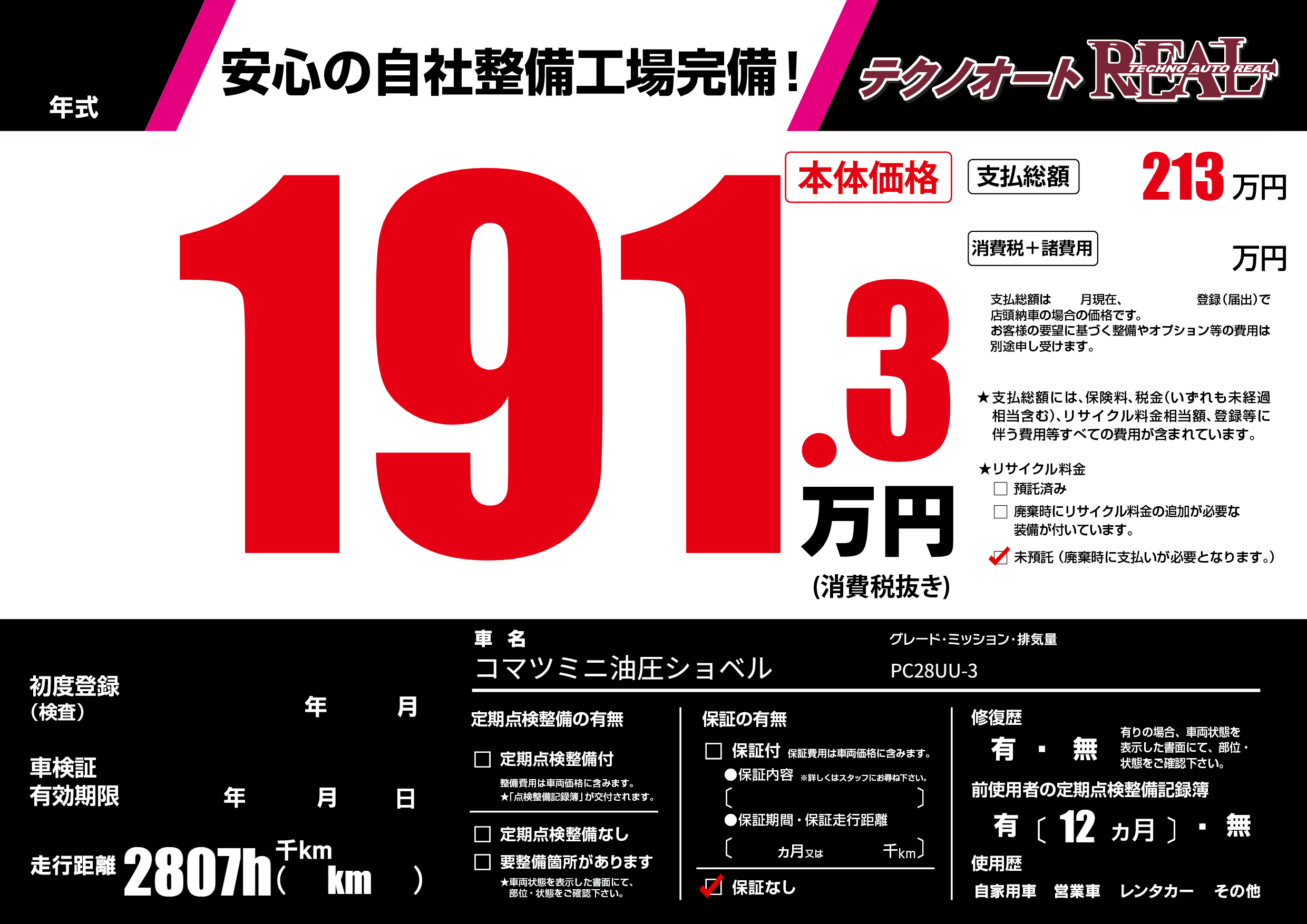 | 車名 | コマツミニ油圧ショベル | グレード ミッション 排気量 |